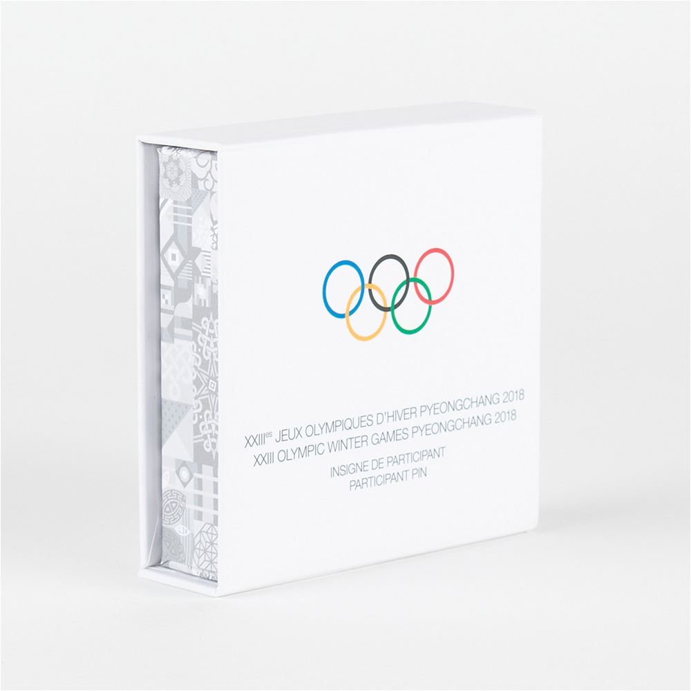Official gold-plated athlete's participation pin from the PyeongChang 2018 Winter Olympics. 1 gm, 12 mm x 19 mm, which features the Olympic rings over a flaming 2018 torch. Reverse features the mint mark, "Bertoni, Milano," and the serial number, "189112." Includes the original paper presentation box with matching label.