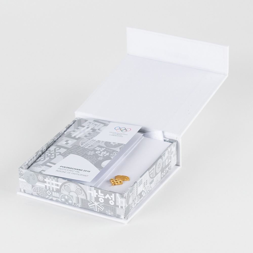 Official gold-plated athlete's participation pin from the PyeongChang 2018 Winter Olympics. 1 gm, 12 mm x 19 mm, which features the Olympic rings over a flaming 2018 torch. Reverse features the mint mark, "Bertoni, Milano," and the serial number, "189112." Includes the original paper presentation box with matching label.