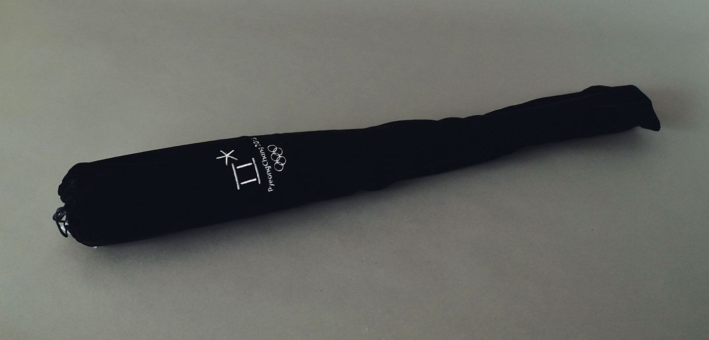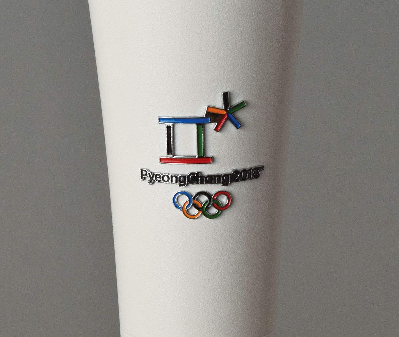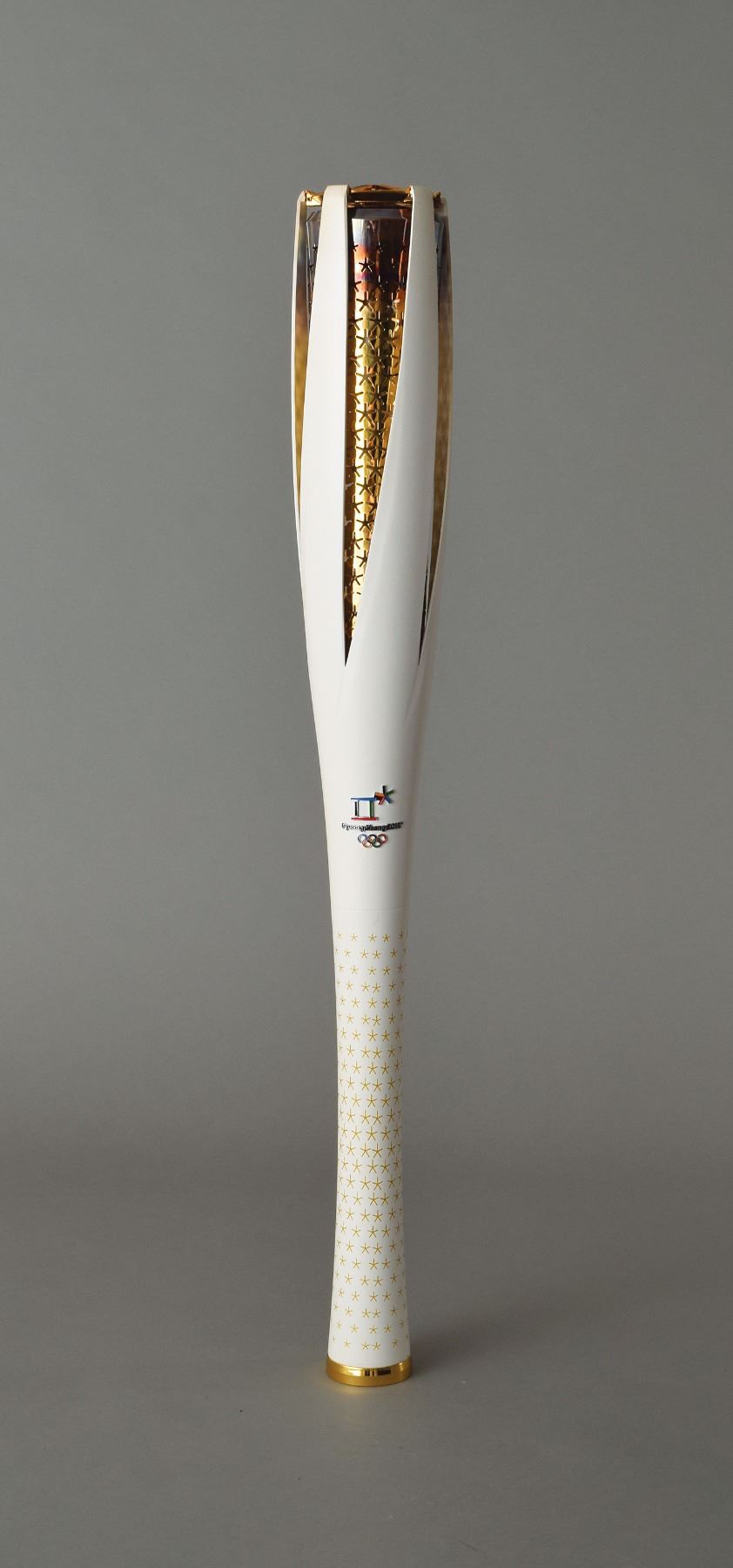 Official 2018 PyeongChang Winter Olympics torch, constructed of a white metal exterior shell with gold-colored metal interior, measuring 27.5? in length and 3.25? at its widest point, designed and manufactured by Young-se Kim, Inno Design / Groupe Hanhwa. At the top, the exterior shell is divided into five vertical branches to form a pentagonal shape, representing the sporting passion and spirit that unites the five Olympic continents (Africa, Europe, the Americas, Asia, and Australia). A colorful raised PyeongChang 2018 emblem decorates the body of the torch, and the handle is printed with golden stars and bears an identification label: “001–096.” The white and gold colors used in the design represent the snow and ice of the Winter Games, as well as the Olympic flame, and correspond with the color scheme of the PyeongChang relay. The 700 millimeter length of the torch represents the altitude of PyeongChang, which lies 700 meters above sea level. The torch is specially designed so that the flame can burn continuously despite inclement weather: it generates an air tunnel that sends more oxygen to the flame, and a pentagonal hole at the bottom of the torch allows water to drain. Complete with its drawstring bag and carrying tube.