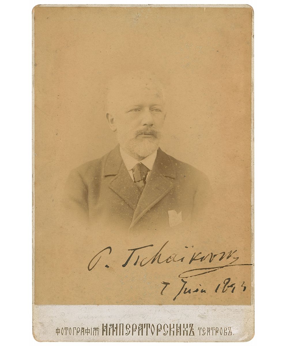 Esteemed Russian composer (1840–1893) whose colorful, dramatic, and expressive works represent the epitome of the Russian Romantic tradition and take a place among the most beloved staples of the concert repertory. Original 4.25 x 6.5 cabinet bust portrait, signed at the bottom of the image in black ink, “P. Tchaikovsky, 7 Juin 1893.” Published by a Russian studio. In fine condition, with scattered surface scuffing, erased notation in lower border, and mounting remnants to reverse. This dates to Tchaikovsky’s final year, during the period in which he was working on his Symphony No. 6. He led the premiere on October 28, 1893, just nine days before his sudden death at the age of 53. Signed photos of the renowned composer are fantastically rare, and this is the first uninscribed example we have encountered.