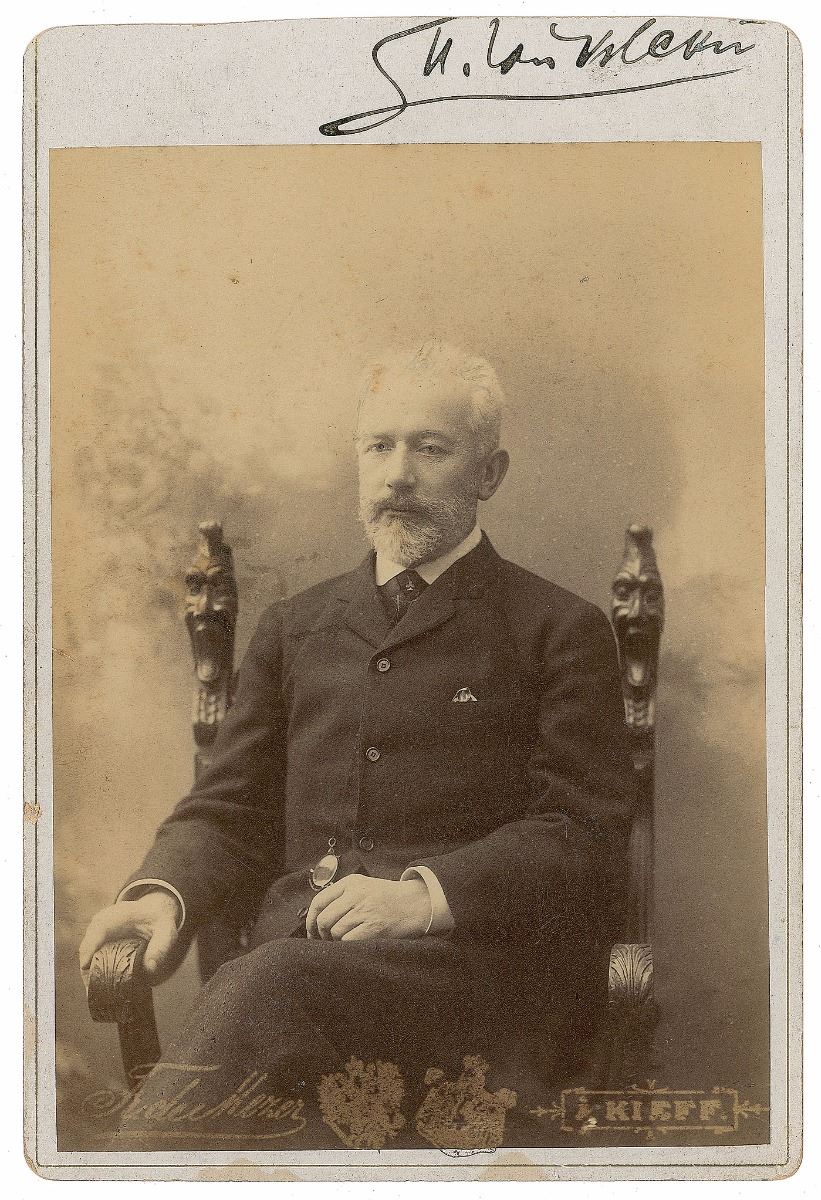 Exceptional original 4.25 x 6.25 cabinet portrait of Tchaikovsky in a seated pose, boldly signed in the upper border in Cyrillic in black ink, “P. I. Tchaikovsky.” Published by Fr. deMezer and Kieff. In fine condition, with slight rubbing to the image and a trimmed top edge slightly impinging on the very bold signature. A highly desirable and uninscribed example of Tchaikovsky in a rare seated pose.