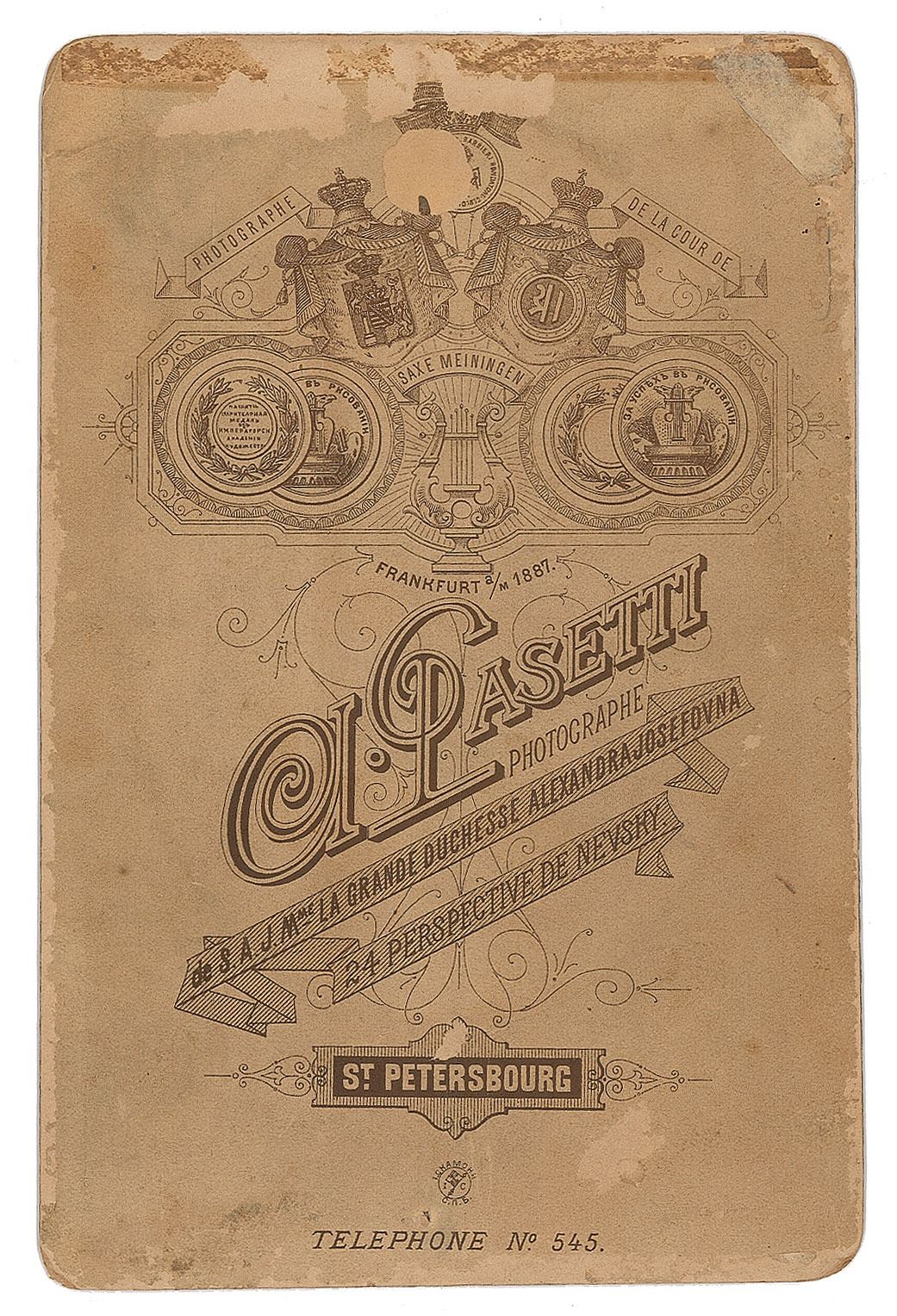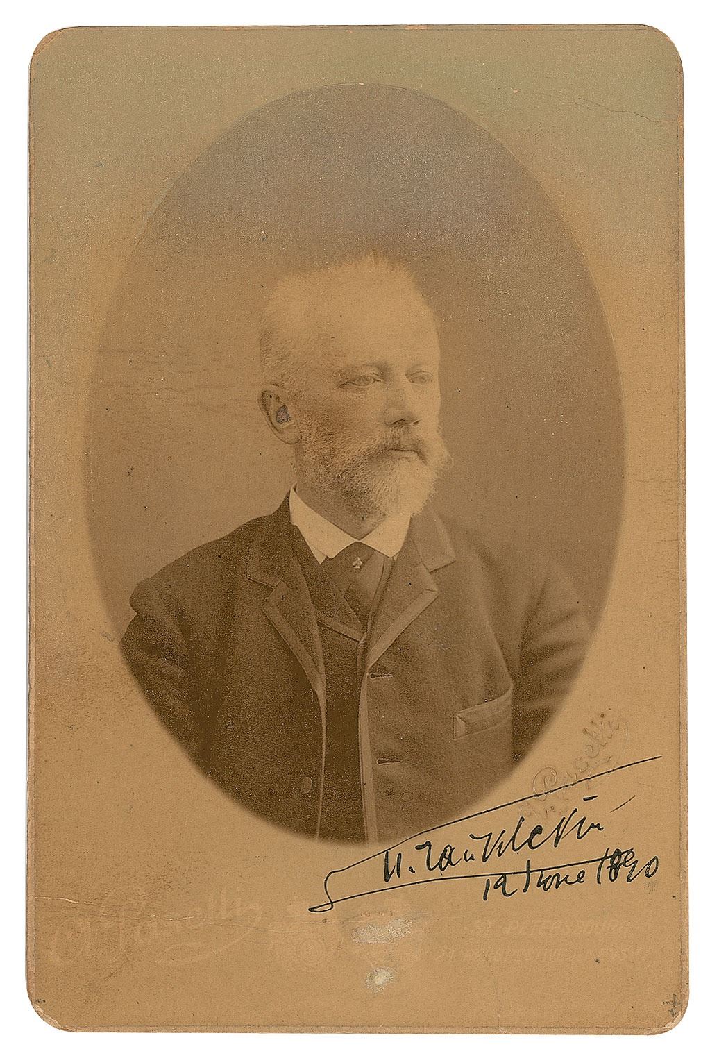 Rare and magnificent 4.25 x 6.5 cabinet photo of Tchaikovsky by A. Pasetti of St. Petersburg, boldly signed in black ink and dated June 19, 1890. In very good condition, with creasing, toning, and a rubbed-off area of surface loss below the signature. A highly desirable and exceedingly rare uninscribed portrait of the revered Russian composer, remembered for his iconic ballets The Nutcracker and Swan Lake, as well as the 1812 Overture.