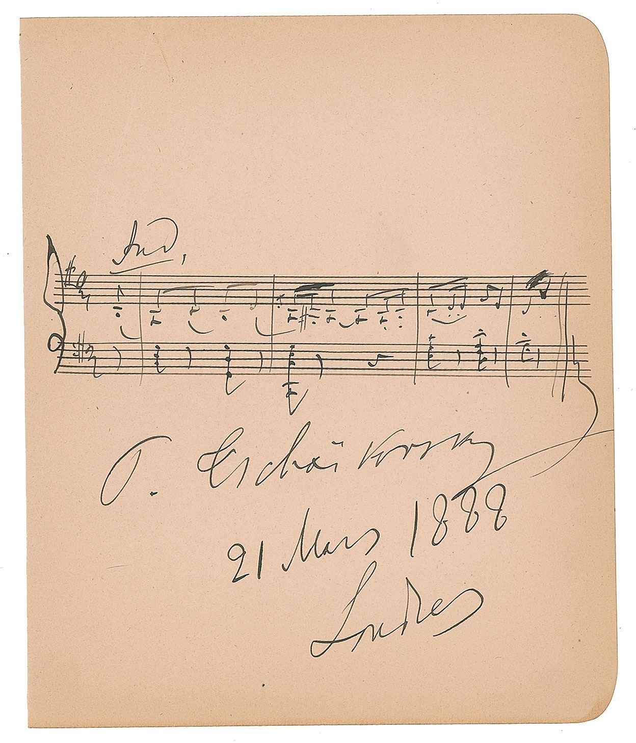 Very rare and highly sought-after AMQS on an off-white 6.75 x 8.25 album page, signed at the bottom in black ink, "P. Tchaikovsky, 21 Mar 1888, London." Tchaikovsky boldly pens five bars of music on two staves. In fine condition.