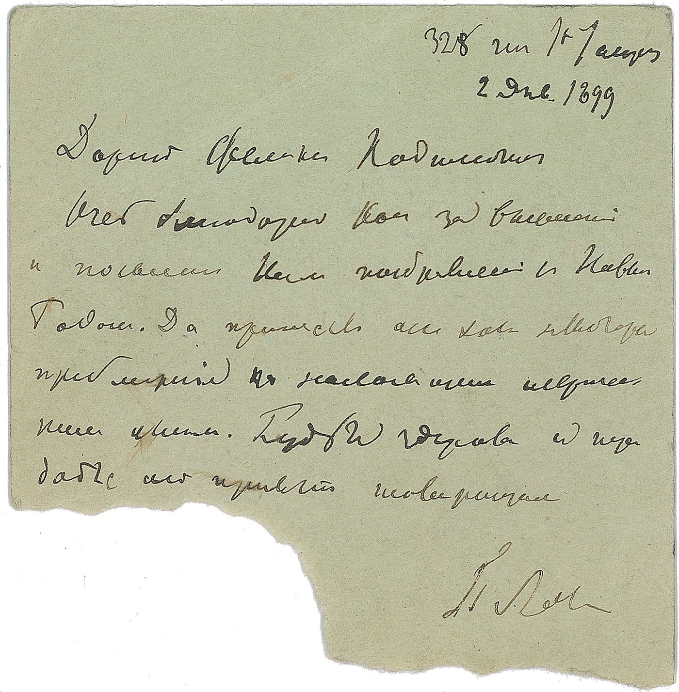 Prominent Russian theorist of narodism, philosopher, publicist, and sociologist (1823–1900) who endorsed revolutionary socialist ideals. Two ALSs in Cyrillic, signed "P. Lavrov," each one page on a postcard, one 3.5 x 5.5 and the other torn to 3.5 x 3.5, dated 1897 and 1899. Both untranslated and sent to the Russian revolutionary, journalist, and writer Felix Volkhovsky. Aforementioned tear to one postcard, and scattered creases, otherwise fine condition. Accompanied by an unsigned photo of Lavrov on his deathbed, a letter by journalist Nathan Golant, and one additional contemporary letter.