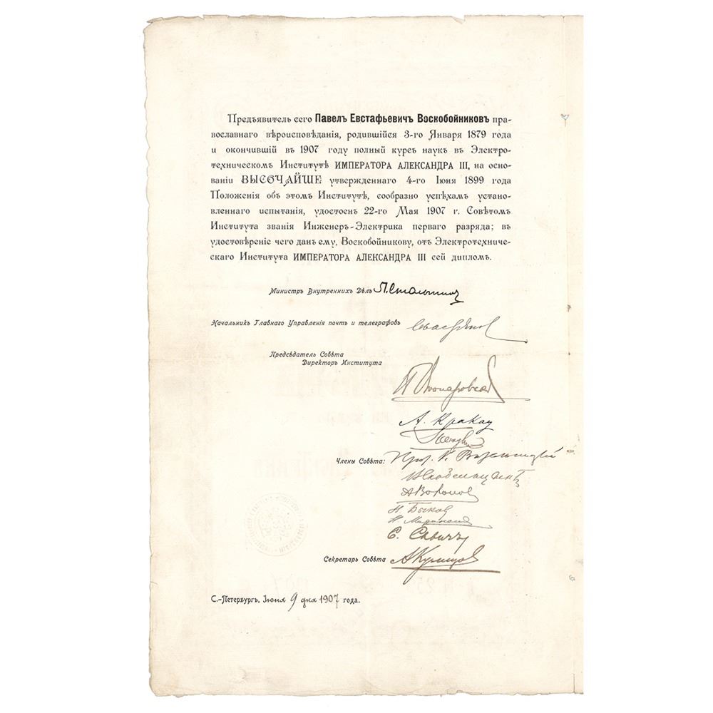 DS in Cyrillic, three pages on two adjoining sheets, 9 x 14.5, 1907. Untranslated document issued as No. 259, signed in bold ink by Pyotr Stolypin as Prime Minister of Russia. In fine condition, with intersecting folds, and small binding holes along the hinge.