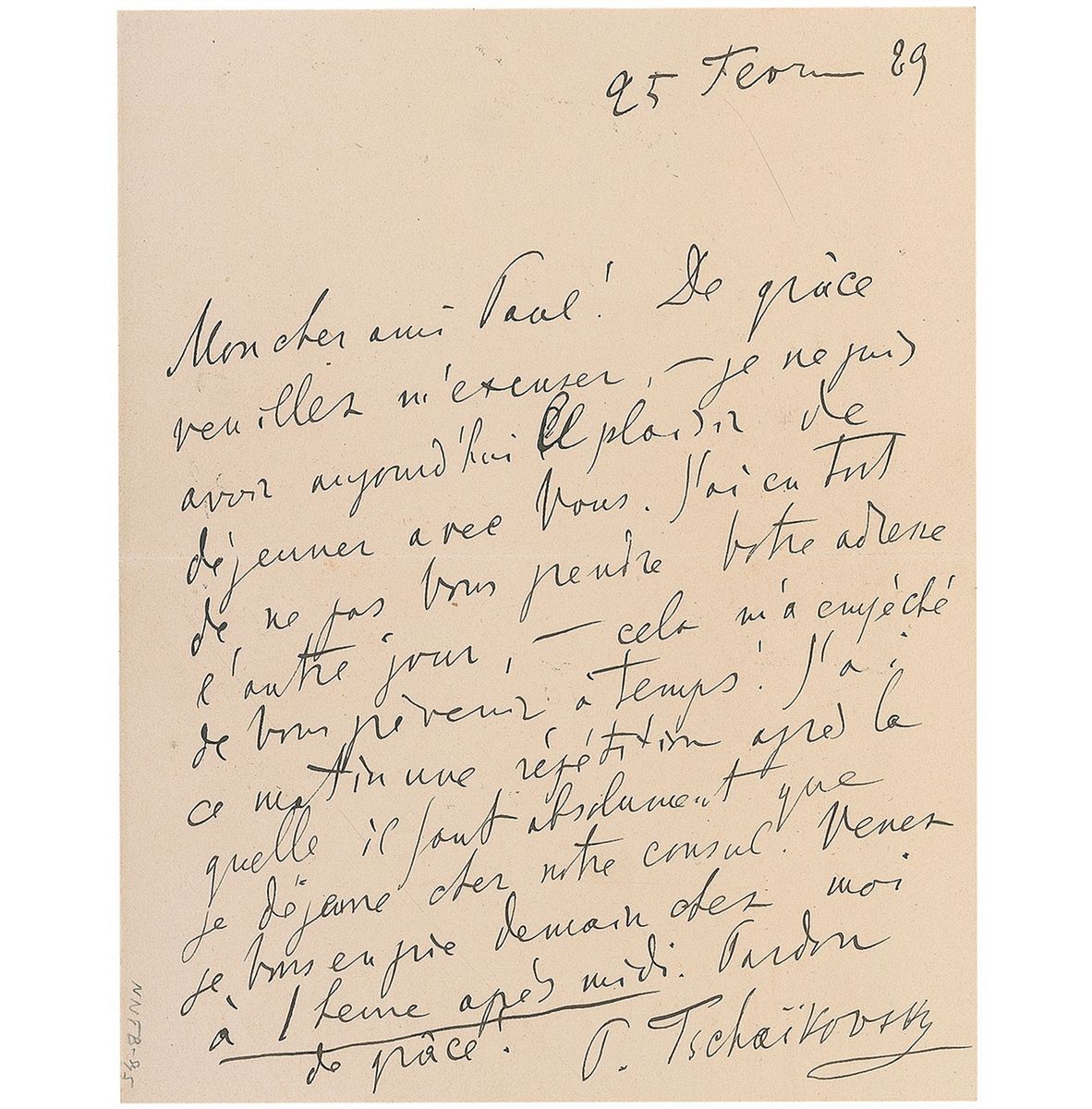 Rare and desirable ALS in French, signed “P. Tchaikovsky,” one page, 4.5 x 5.75, February 25, 1889. Letter to “Mon cher ami Paul,” [‘My dear friend Paul,’ most likely Paul Cossmann, German writer and director of the magazine Süddeutsche Monatshefte and a longtime friend of Tchaikovsky’s]. In full: “I beg you to excuse me. I will not be able to have the pleasure of having lunch with you today. I was wrong not to have taken your address the other day. This prevented me to advise you in time. This morning I have a rehearsal after which I absolutely need to have lunch with the Russian Consul. Please come tomorrow to my house at one in the afternoon. Pray excuse me.” In fine condition, with small pencil notation along hinge.
