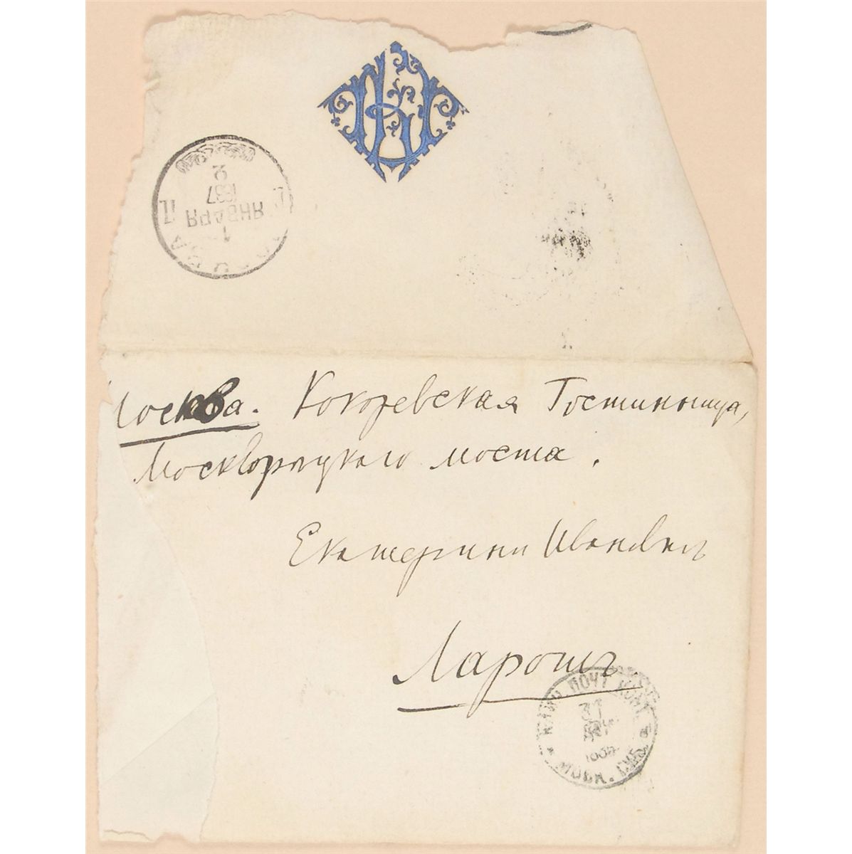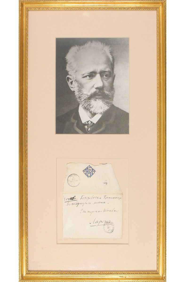 Unsigned monogrammed mailing envelope, 5 x 3.5, addressed in Tchaikovsky’s hand in Cyrillic, and bearing a January 1887 Russian cancellation. Matted and framed with a portrait of the composer to an overall size of 12 x 22.5. In fine condition, with scattered light soiling and paper loss along left edge. The composer had returned to Russia and become a highly sought-after conductor both at home and abroad.