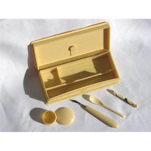 Celluloid Box with five piece contents. Pyralin is stamped on the bottom of the box. The contents include a small round box w/lid, a spoon, a three in one nail file and a nail scraper. The inside of the lid has a piece attached to hold some kind of object. The three in one nail file has "Depooe" stamped in it. Condition is good, with a few spots on the top of the box and a 2.5" discolored mark on the bottom of the box, two nibbles on the bottom front lip of the box. The nail scraper has one small yellow spot by the metal piece. Due to age, celluloid usually has some tiny flaws. This is a great little set. It will enhance any collection. See photos. Have a glance at my other items. Thank you for viewing.