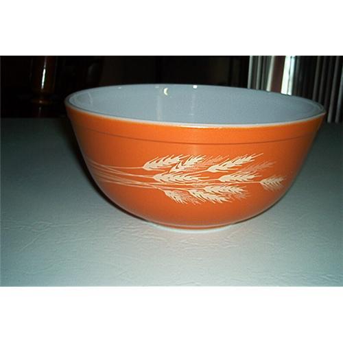 Featuring at today's auction is a lovely round pyrex bowl. Red background with cream colored wheat sheves. Round Pyrex Bowl-Autum Harvest-Bottom embossed: #403-2.5qt-Pyrex-For Oven And Microwave-No Stovetop Or Broiler-Corning, NY-USA-#33. Excellent Condition.