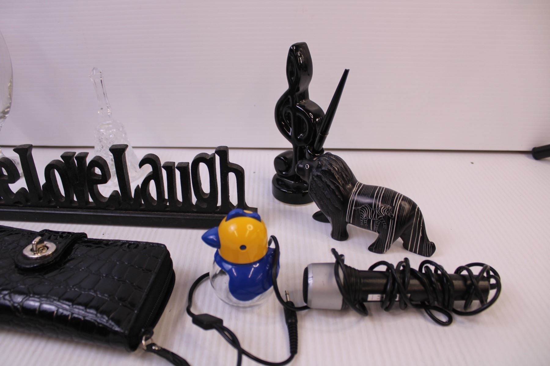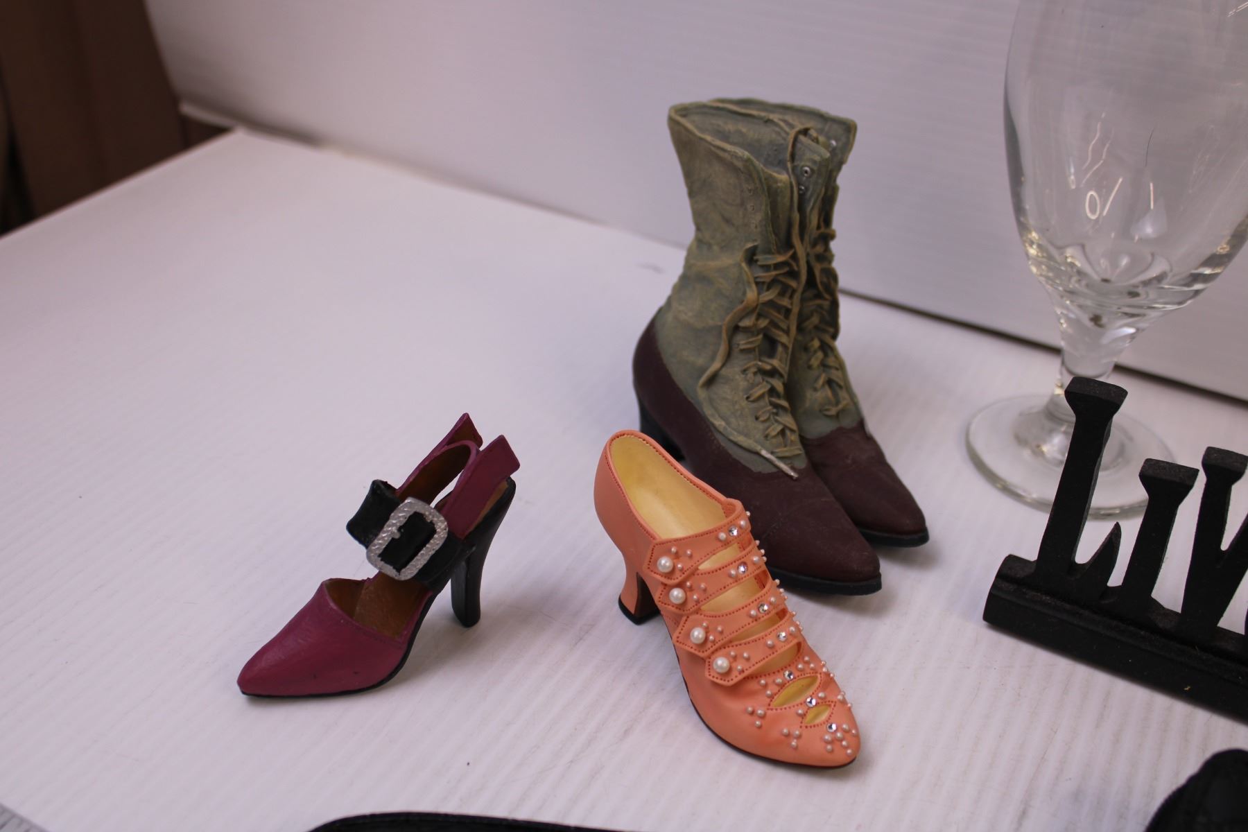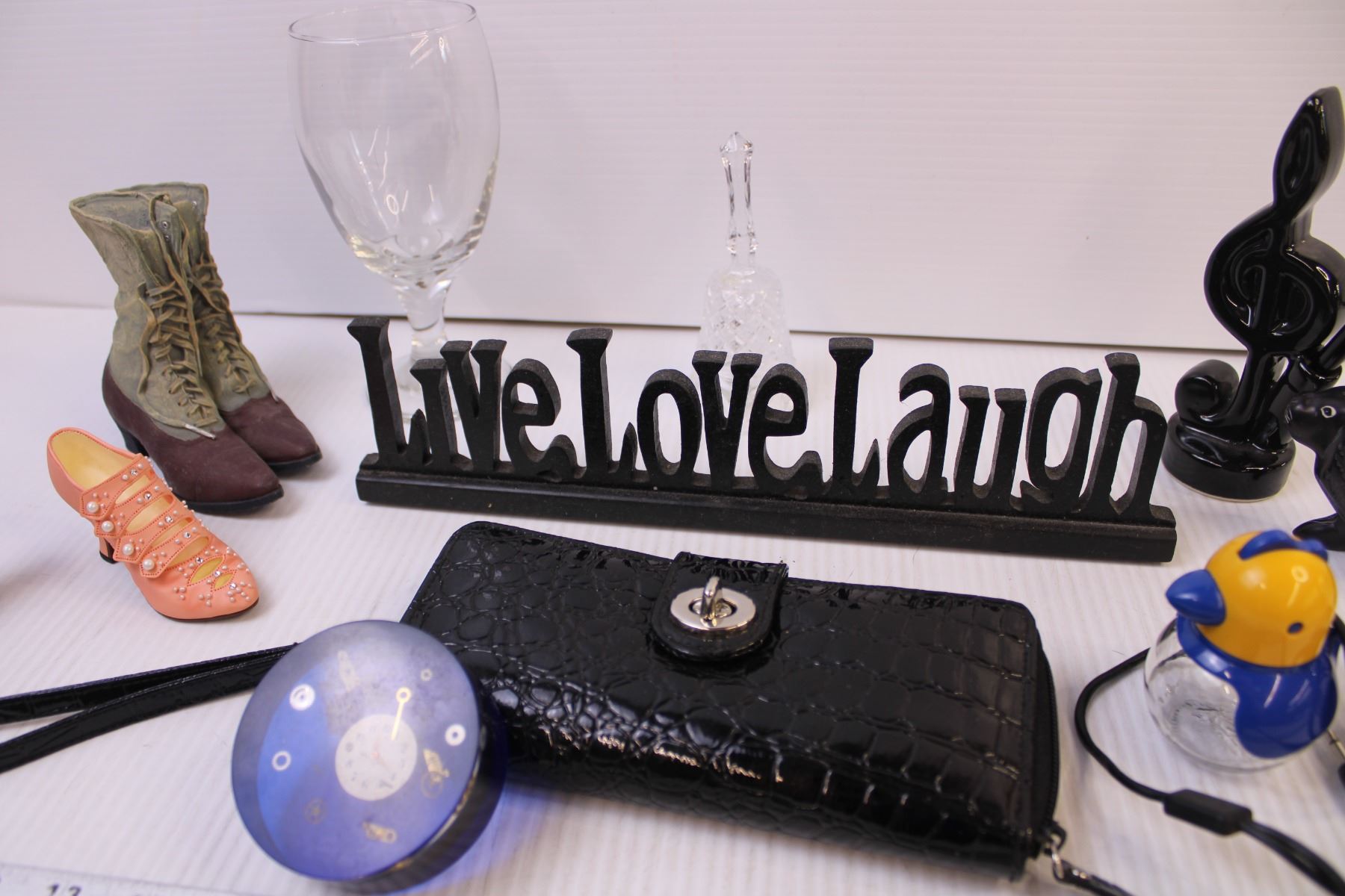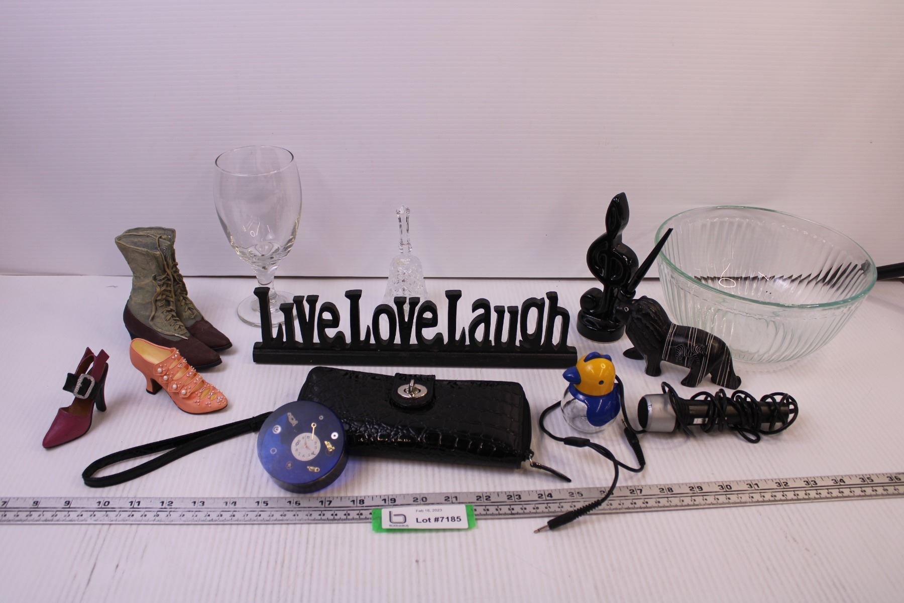 Pyrex Bowl, (3) Decorative Shoes, (5) Decor Items and Wallet