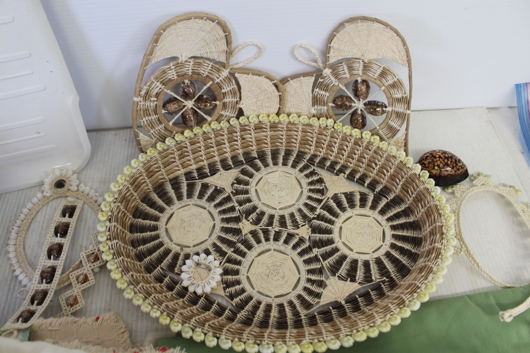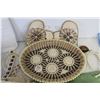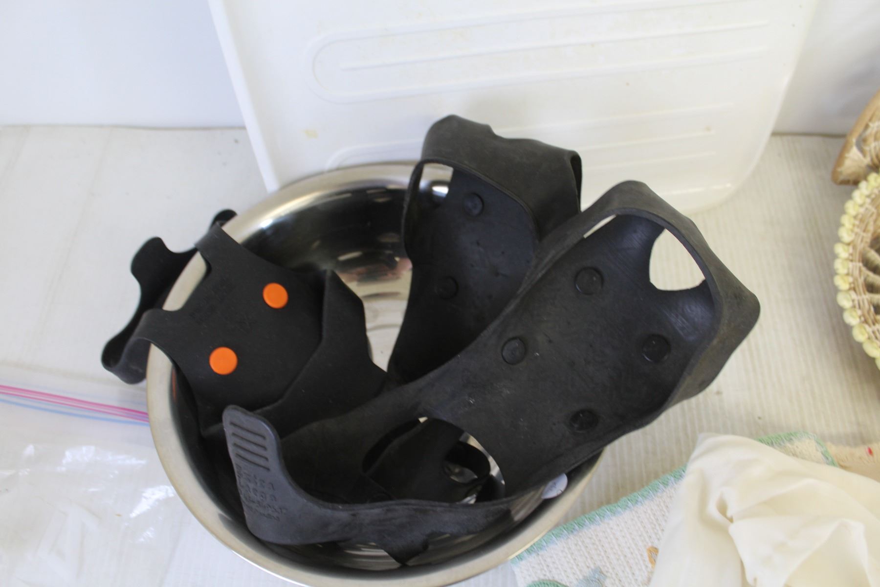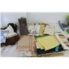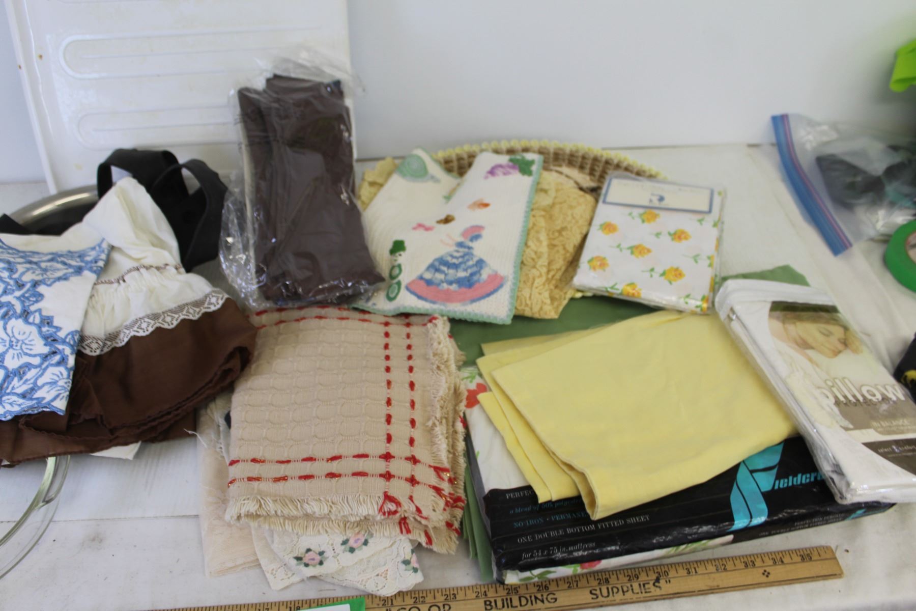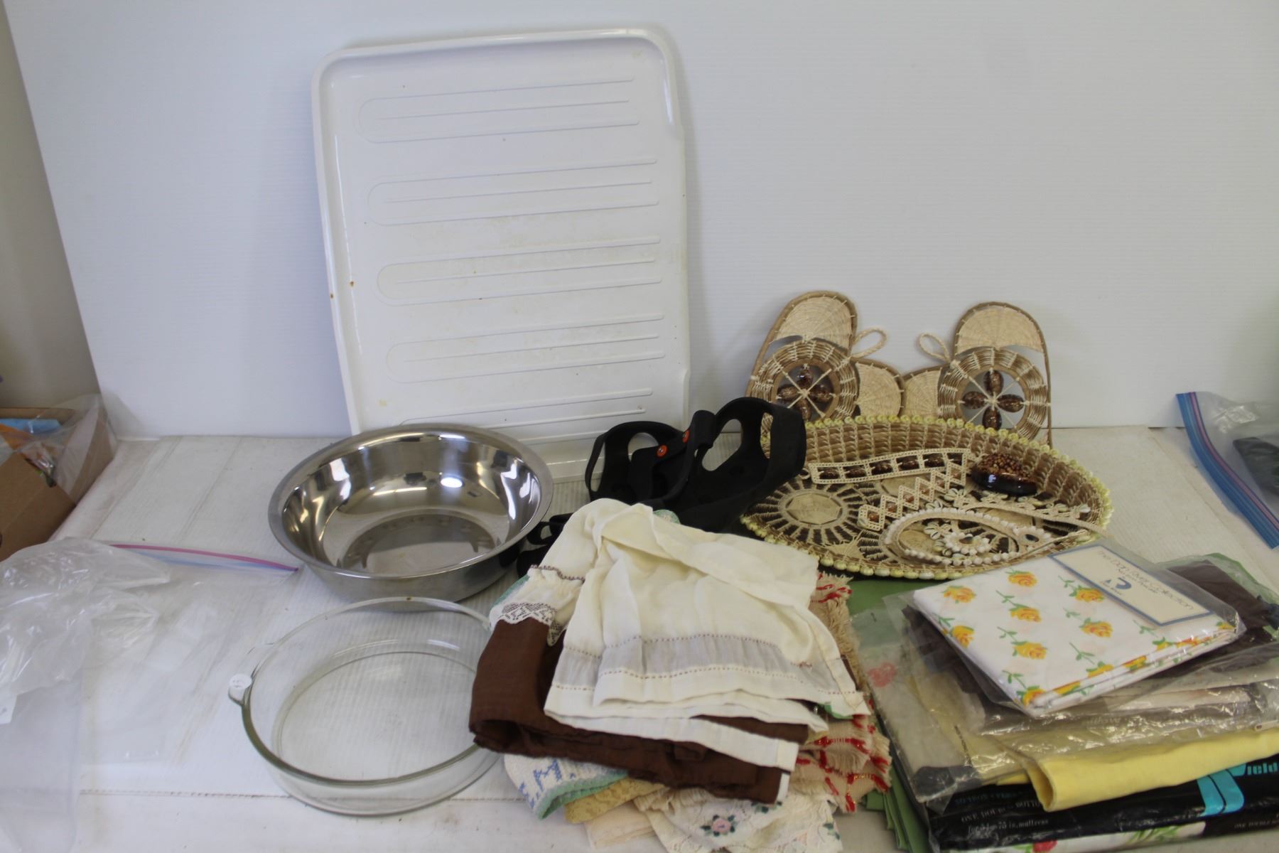 Pyrex Cake Pan, (9) Shell Décor Items, (3) Ice Shoes, + Misc. Kitchen Linens 78