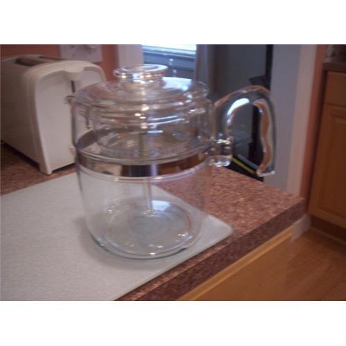 This is a 9 cup Flameware Coffeepot made by Pyrex. It's one of the best ones I've seen in a while. You can clearly see the 6 and 9 measurement bars. It is very clean even under the band. It has the insert and pump and has a lovely blue tint. If you've been thinking about investing in one of these, now might be the time to look.