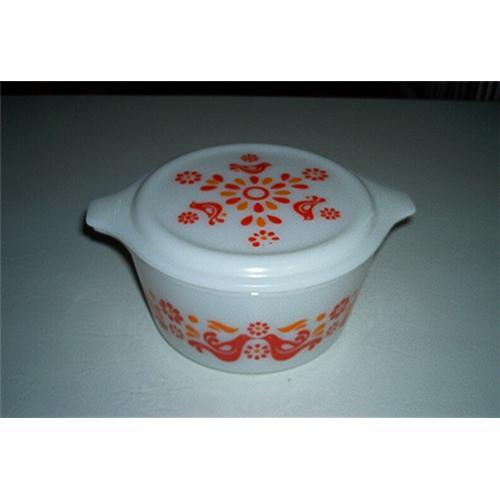 I am featuring at today's auction a "Friendship" Pyrex Covered Bowl. Red birds and flowers with yellow designs decorate the outside of the bowl. Amish style design on white. The lid has the #20-C6 and Pyrex. Bottom of the bowl has: #47-1 Quart-Trademark-Pyrex-Made In USA-Ovenware-#32. Excellent Condition.