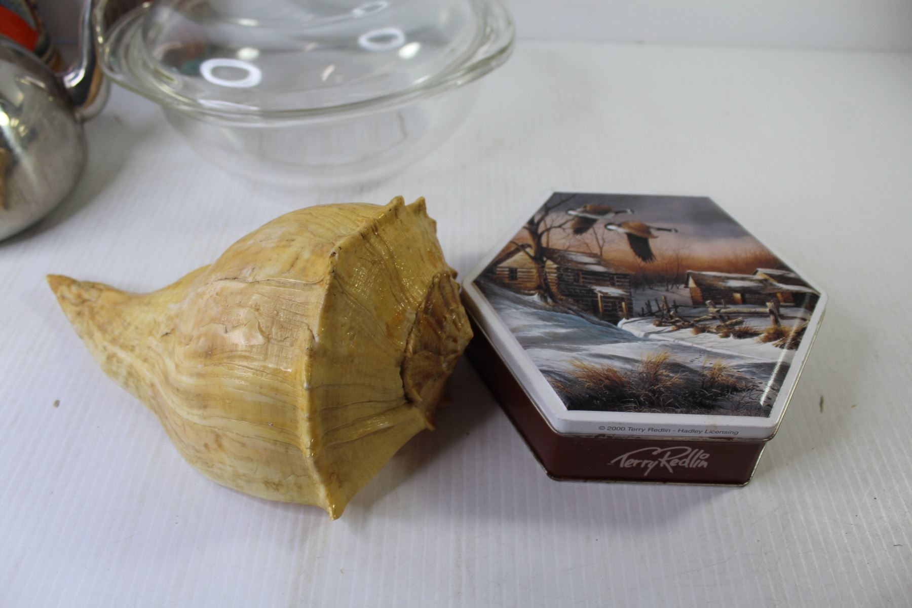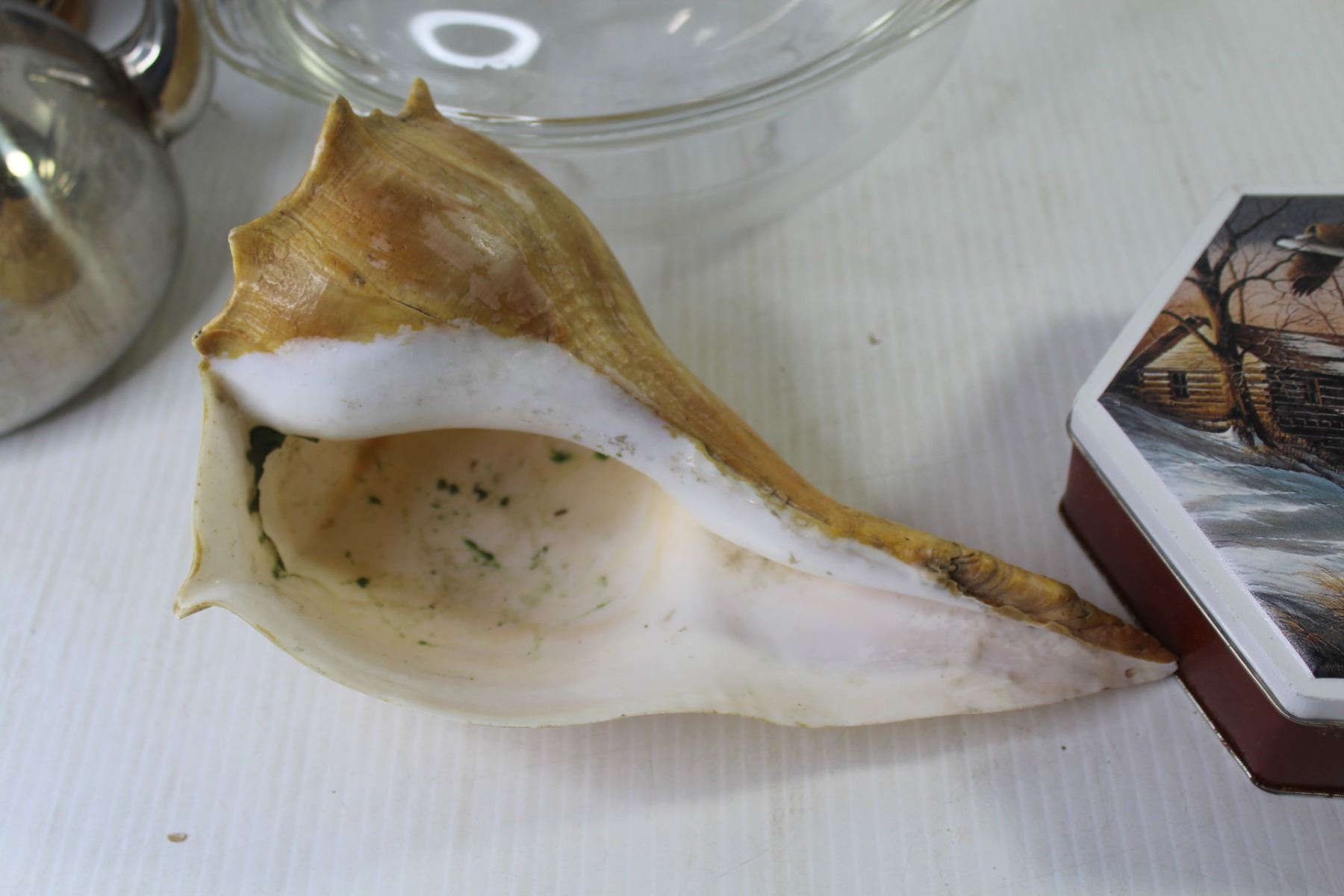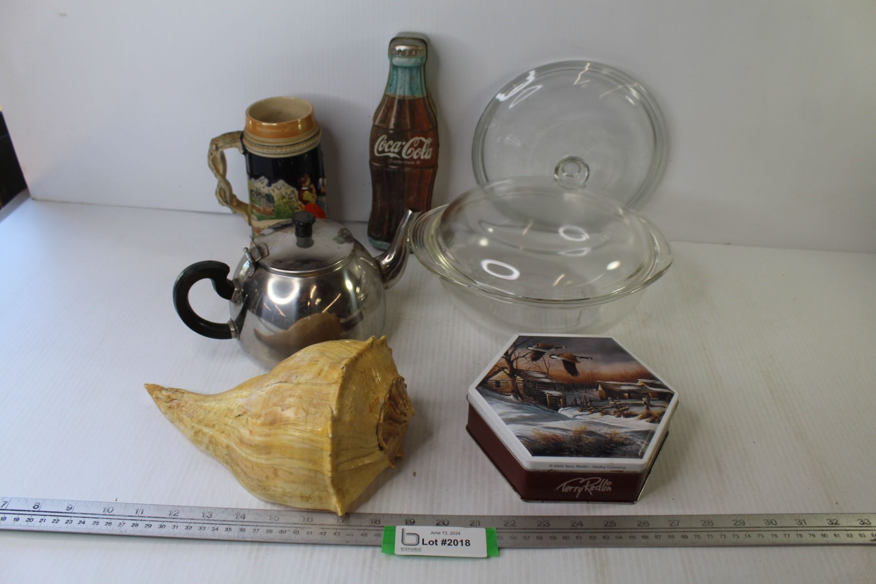 Pyrex Glass Bowl - Conch Shell - Coca-Cola Tin - Metal Teapot - German Beer Stein - Tin - Glass Lid