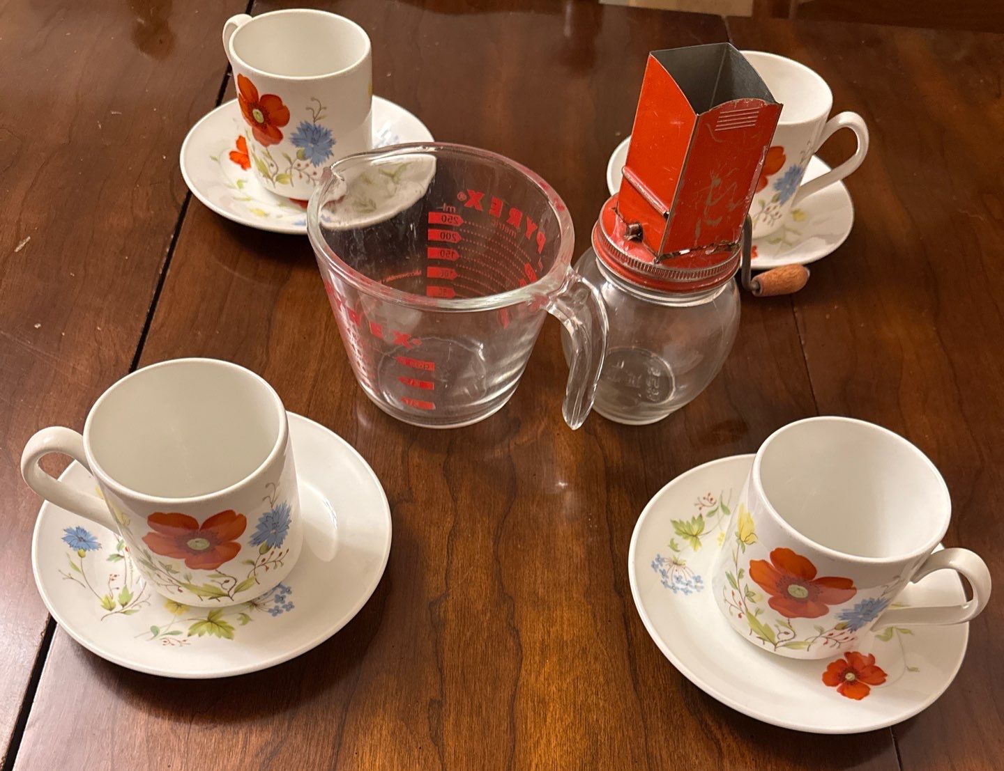 Pyrex Measure Cup, 4Mugs & Saucers & More