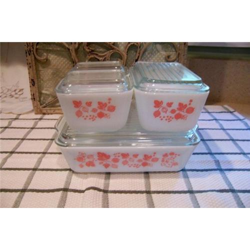 Here is a nice complete set of refrigerator dishes from the 1950's from Pyrex. The pattern is called "Gooseberry" and is light pink on white glass. The set includes: #503 1 1/2 quart. #502 1 1/2 pint, and two #501 1 1/2 cup. The clear glass ribbed lids are in perfect condition, No chipped edges. This set was rarely used if at all. The colors are bright and the finish on all pieces is very shiny. beautiful set!