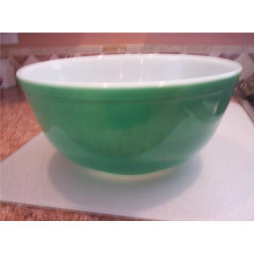 </font></strong>This is a green #403 bowl made by Pyrex. I don't believe it was ever used. It was in the original box but unfortunately, it had water damage and was falling apart. This bowl came from their primary color nesting set which was the first colored bowl set made by Pyrex. I found this in a little shop in Wisconsin. The box only contained three of the bowls. The red one was missing. The box did contain the original packing material. The 2.5 quart green bowl was the second in the set. I have closely examined this bowl, shown lights through it and I can find no scratches to the paint. The inside is a pristine white. The color is bright. No chips are cracks are noted. This Pyrex green #403 bowl is as near to mint as you can get. If you are trying to build a set or just want a great Pyrex bowl, take a look!!</font>