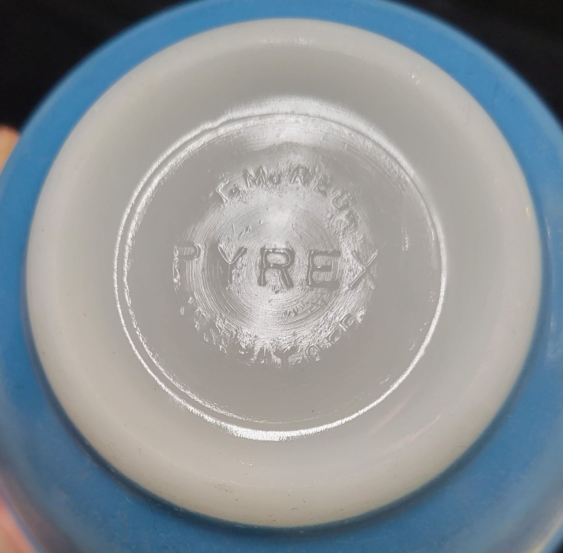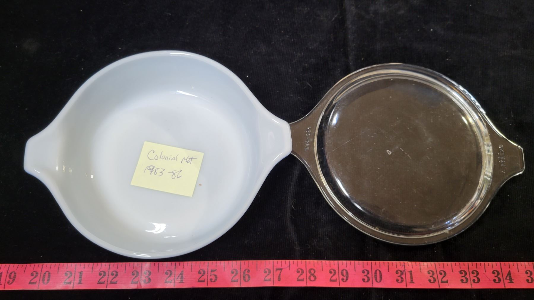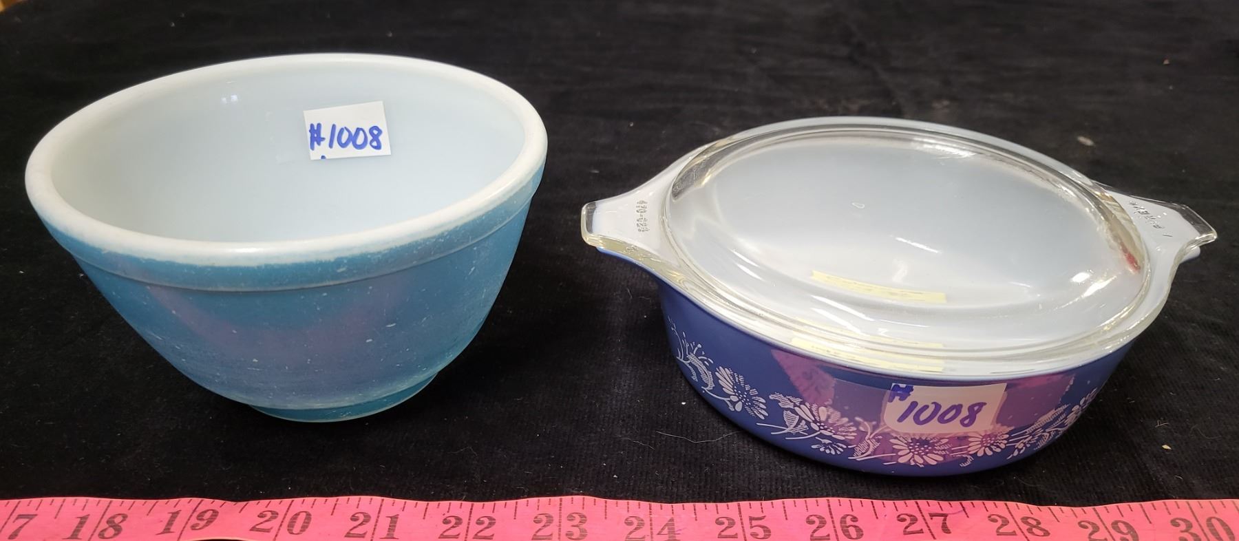 Pyrex blue primary bowl, and 500 ml Colonial Mist casserole, 1983-86