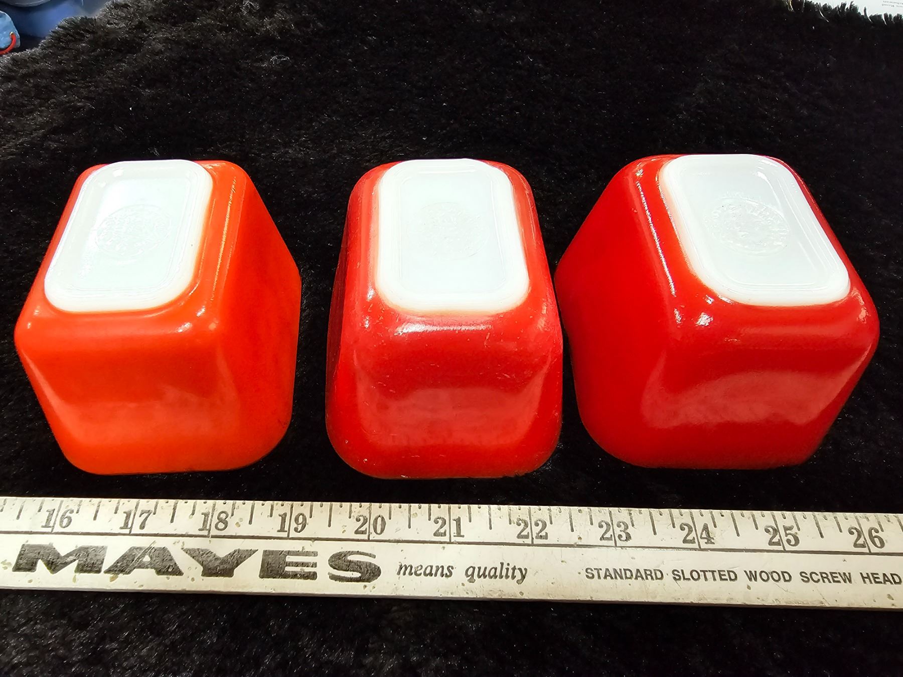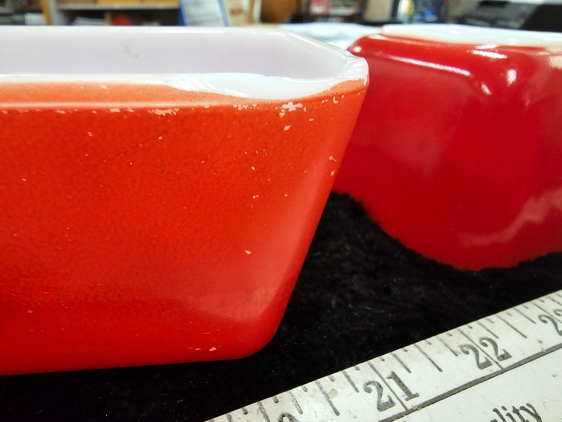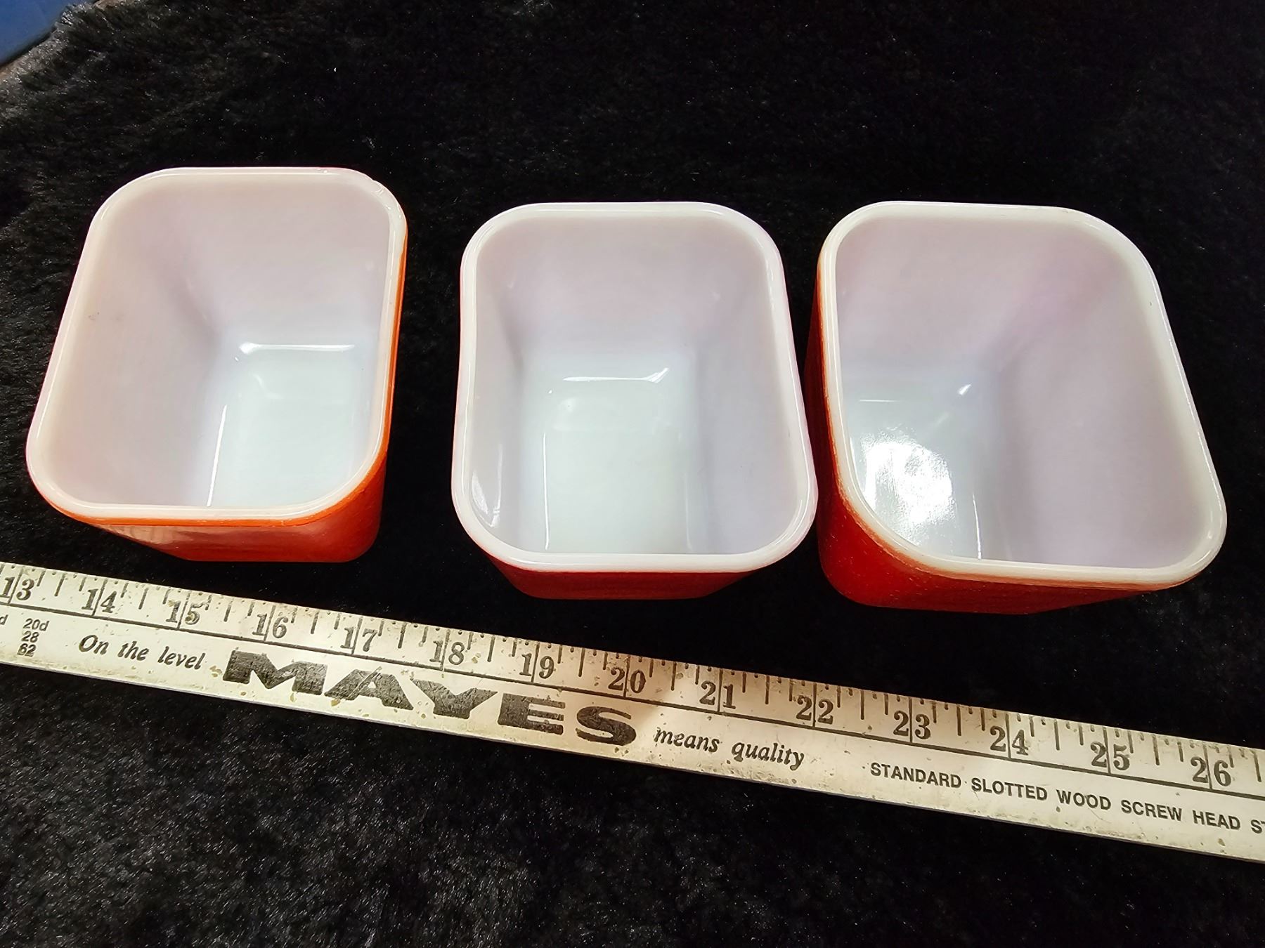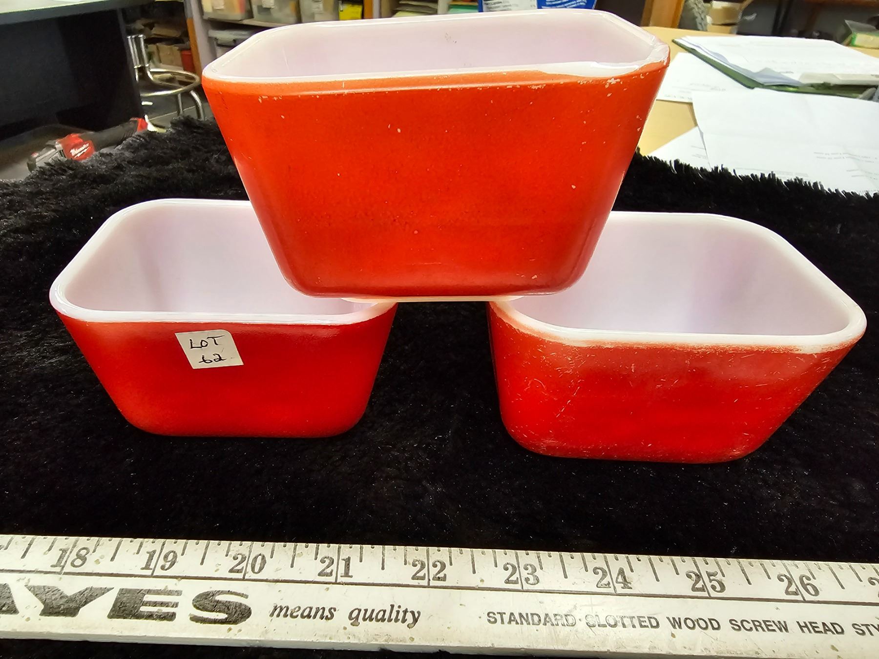 Pyrex red refrigerator dishes - no lids. One has small chip on rim