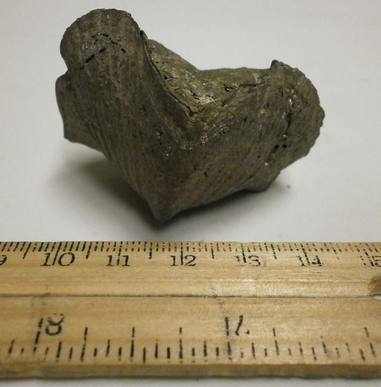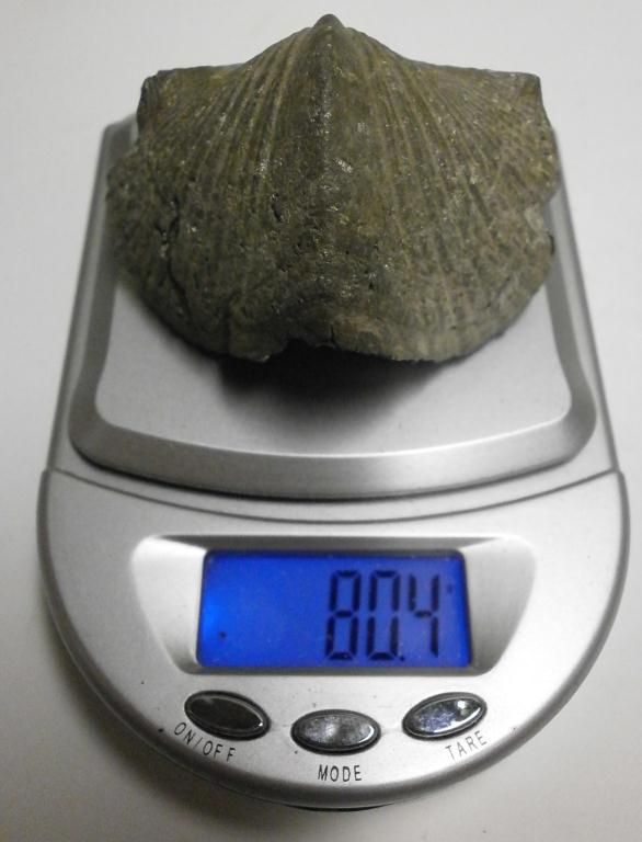Origin unknown. Well preserved brachiopod shell that has fossilized with pyrite mineralization. About 80.4 grams total weight, and overall size about 51mm x 30mm x 38mm.