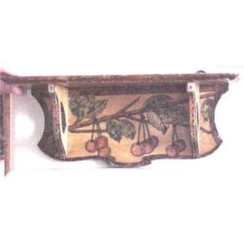 This is a handmade pokerwood shelf for kniick knacks. It was made as a wedding present in 1908 from Karl to Gertrude. The shelf is decorated on the front with branches and green leaves which support dangled bunches of cheries. It is signed faintly on the back of the shelf. The condition is vintage great.