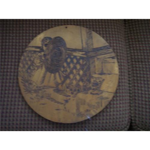 Wonderful pyrography picture of a little child holding I believe a large straw hat in front of him and looking at a butterfly that looks like it is about to land on his sandwich.Lots of wonderful work on this piece and dated 1911.Measures 13 1/2" round.There is a small hole at the top for hanging it.I have three other pictures of this but I am having trouble getting them to go through.If you would like more pictures I will e-mail them to you.