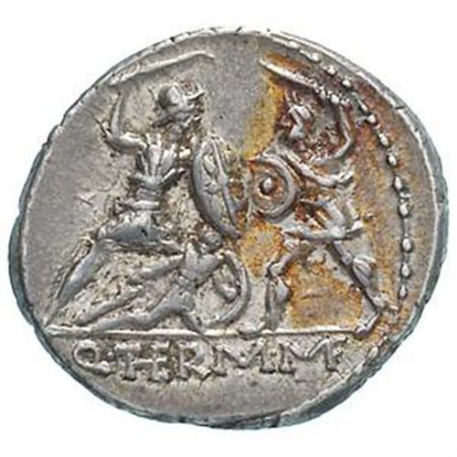 Repubblica Romana. Q. Thermus M.f. Denarius, 103 a.C. D/ Testa di Marte a sinistra. R/ Due guerrieri in combattimento quello a sinistra difende con lo scudo un compagno caduto. In esergo: Q. THERM MF. Cr. 319/1. B. (Minucia) 19. gr. 3.91 AG. SPL. Di qualit inusuale, con bellissima patina di monetiere.