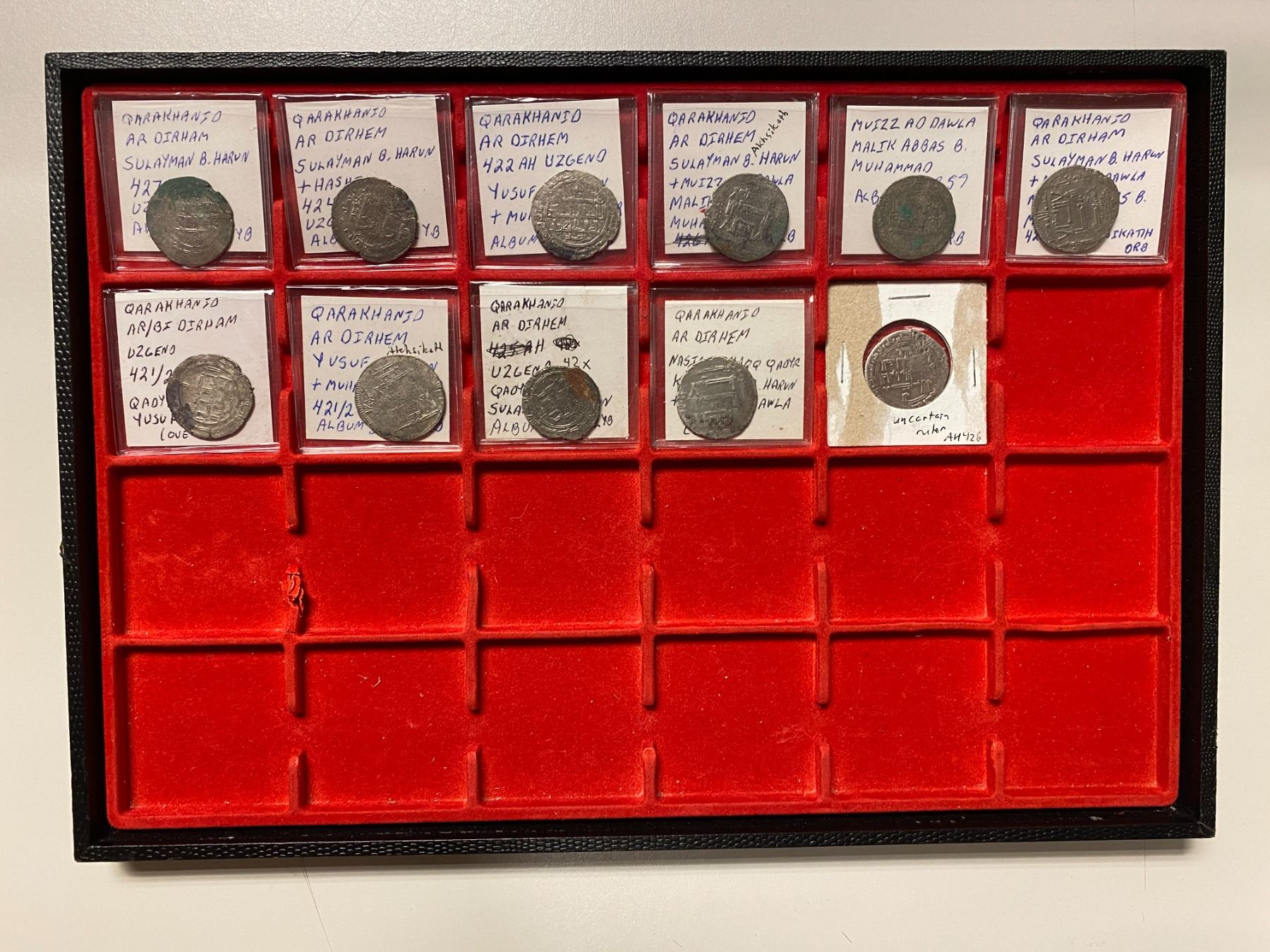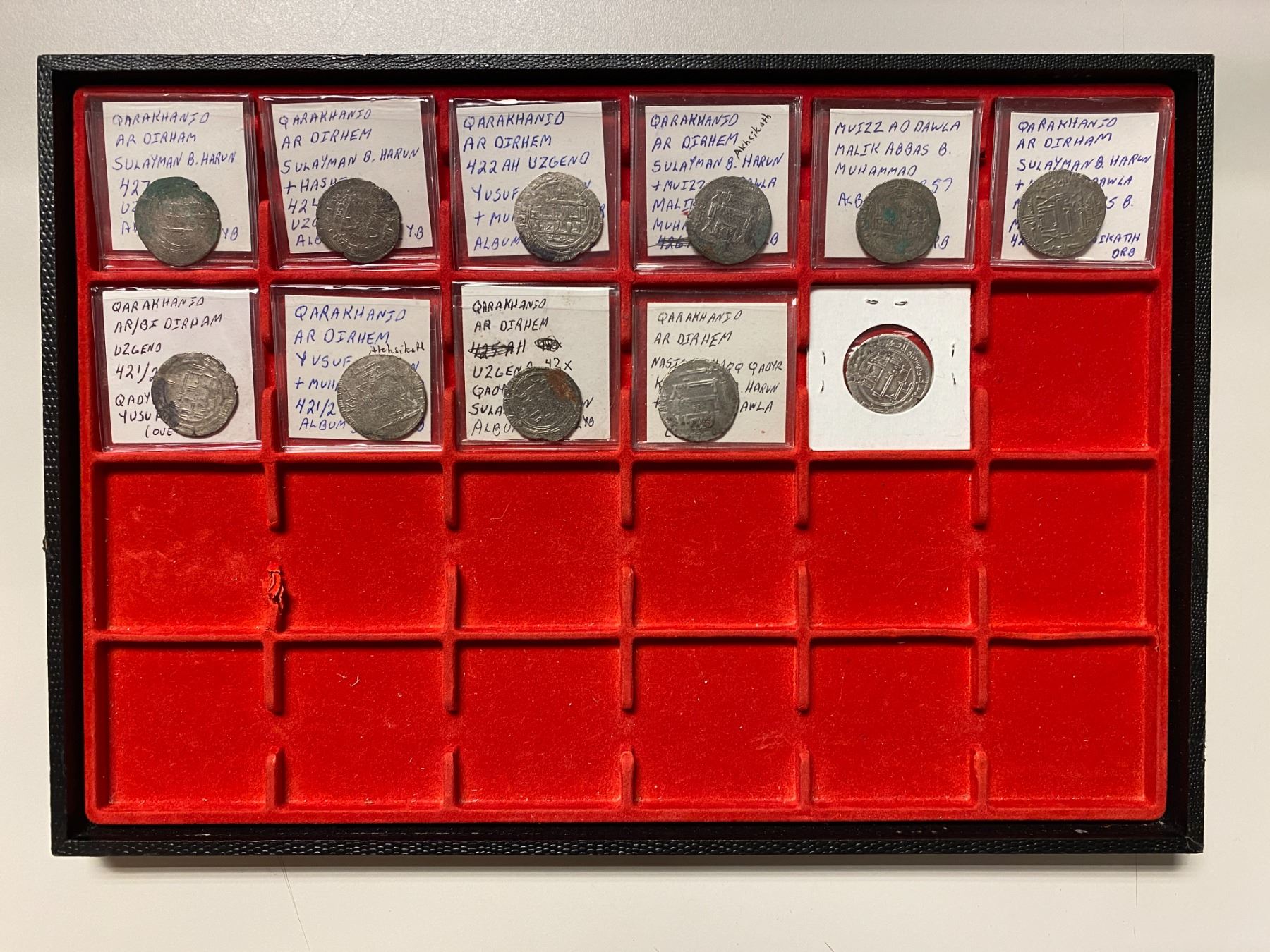 QARAKHANID: LOT of 11 silver dirhams, all are from the AH420s, including the mints of Akhsikath (3 pcs, all with partial dates in the 420s), Uzkand (7, including one each of AH422, 424, and 427, the rest with partial dates), and uncertain mint (1, clear date AH426, possibly from Uzkand); average VF, but all with some weakness, light adhesions, or other surface defects; retail value $550, lot of 11 pieces.