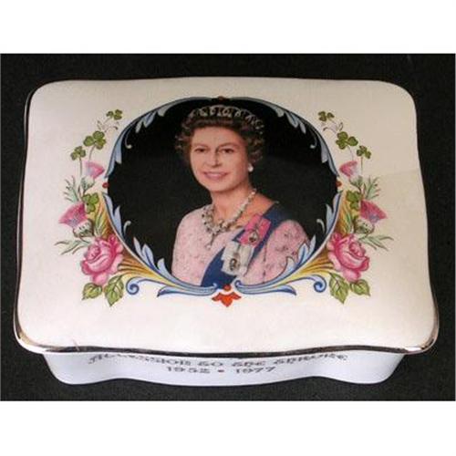 Produced by Crown Staffordshire, this fine bone china dresser box commemorates the 1977 Silver Jubilee of Queen Elizabeth II of England.