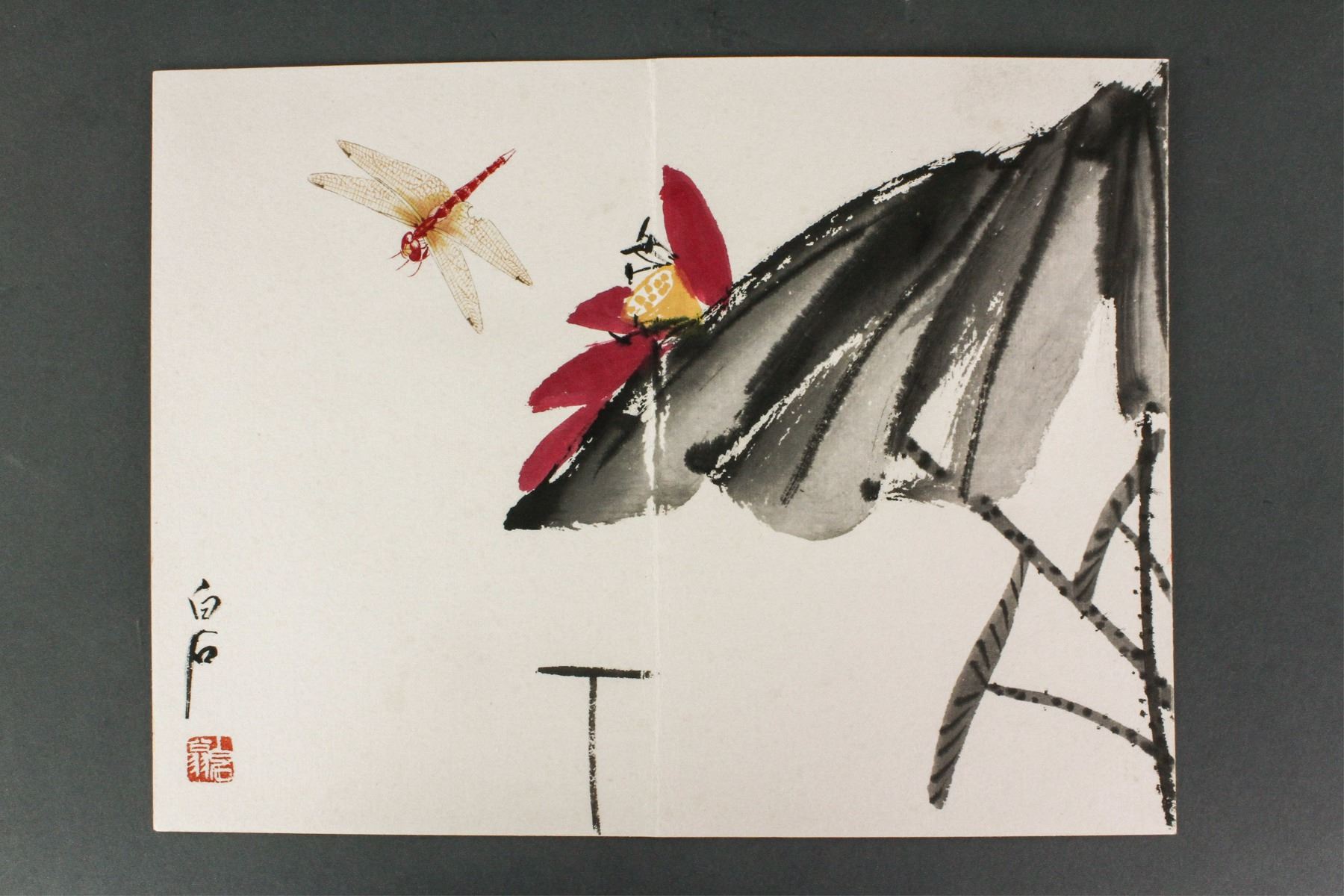 Dragonfly and lotus seedpod; Chinese ink and watercolour on paper; signed Qi Baishi (1864-1957) and inscribed with one artist seal; 16 cm x 24 cm