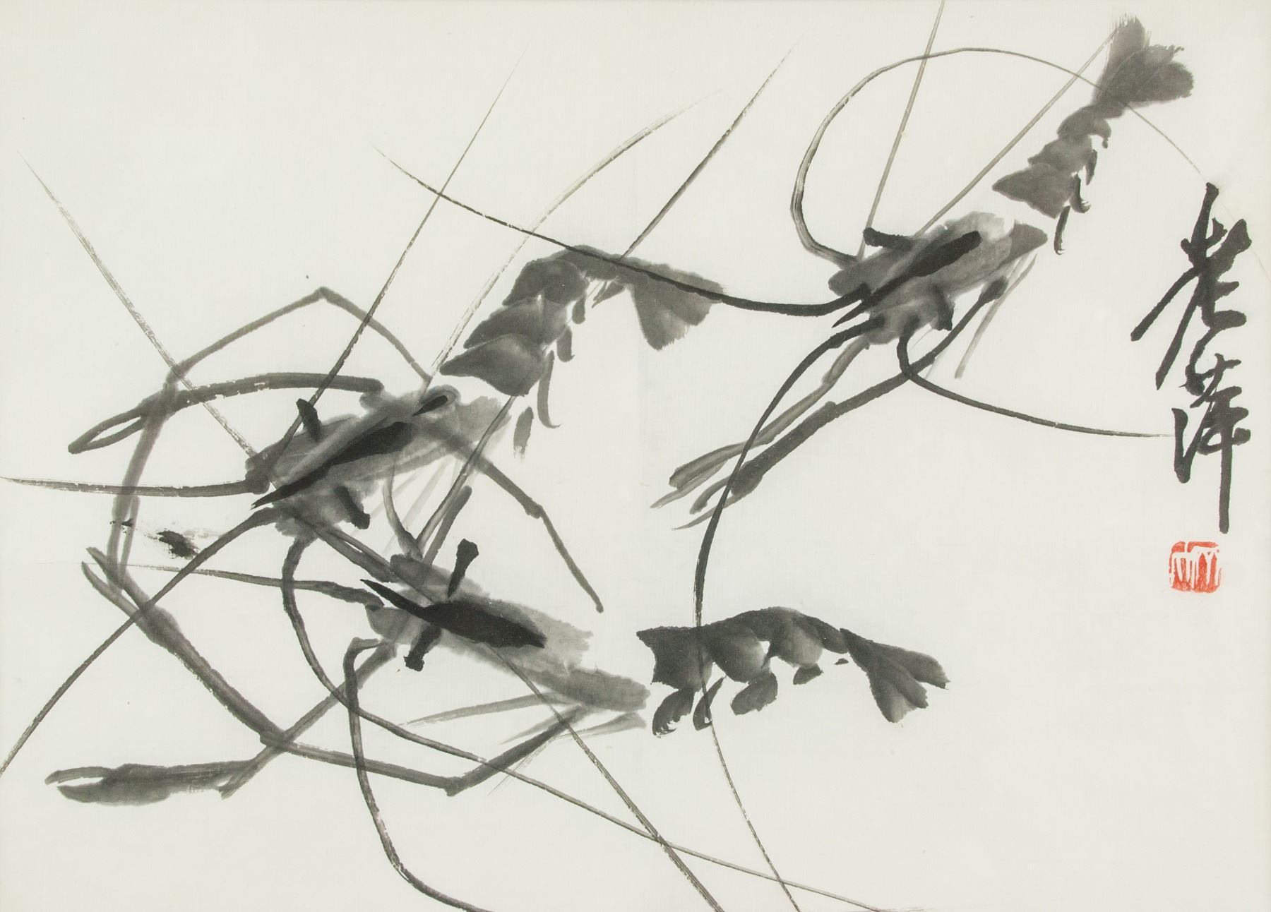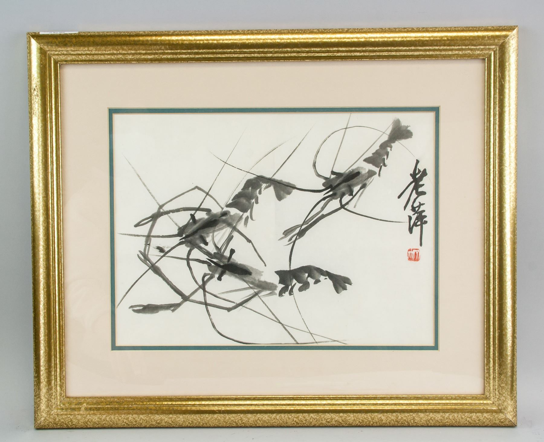 Ink on paper, framed, featuring shrimps, signed and attr. Qi Baishi (Chinese, 1864-1957), inscribed with 1 artist seal, 27 x 38 cm