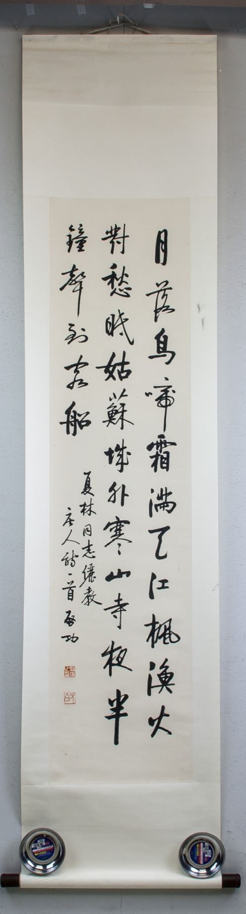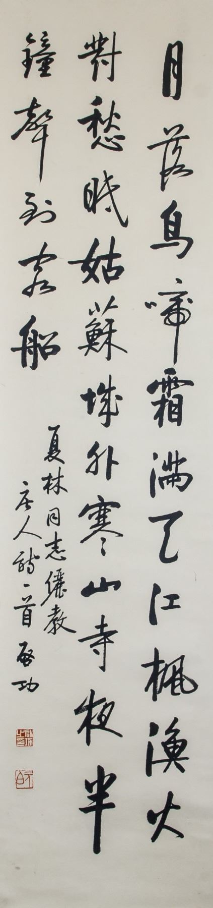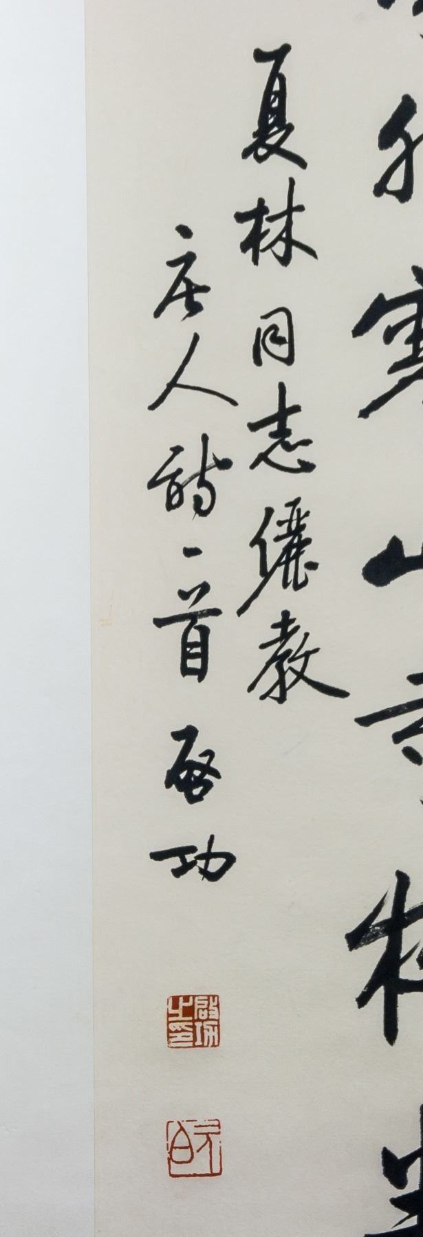 Ink on paper, hanging scroll, featuring Chinese calligraphy in semi-cursive script, signed and attr. Qi Gong (Chinese, 1912-2005), inscribed with 2 artist seals, 137 x 33.5 cm, Qi Gong was a Chinese calligrapher and painter known for his traditional landscapes and depictions of flowers and bamboo. Today, his work is included in the collection of the Metropolitan Museum of Art in New York. PROVENANCE: Property of a gentleman (East Toronto, Canada)