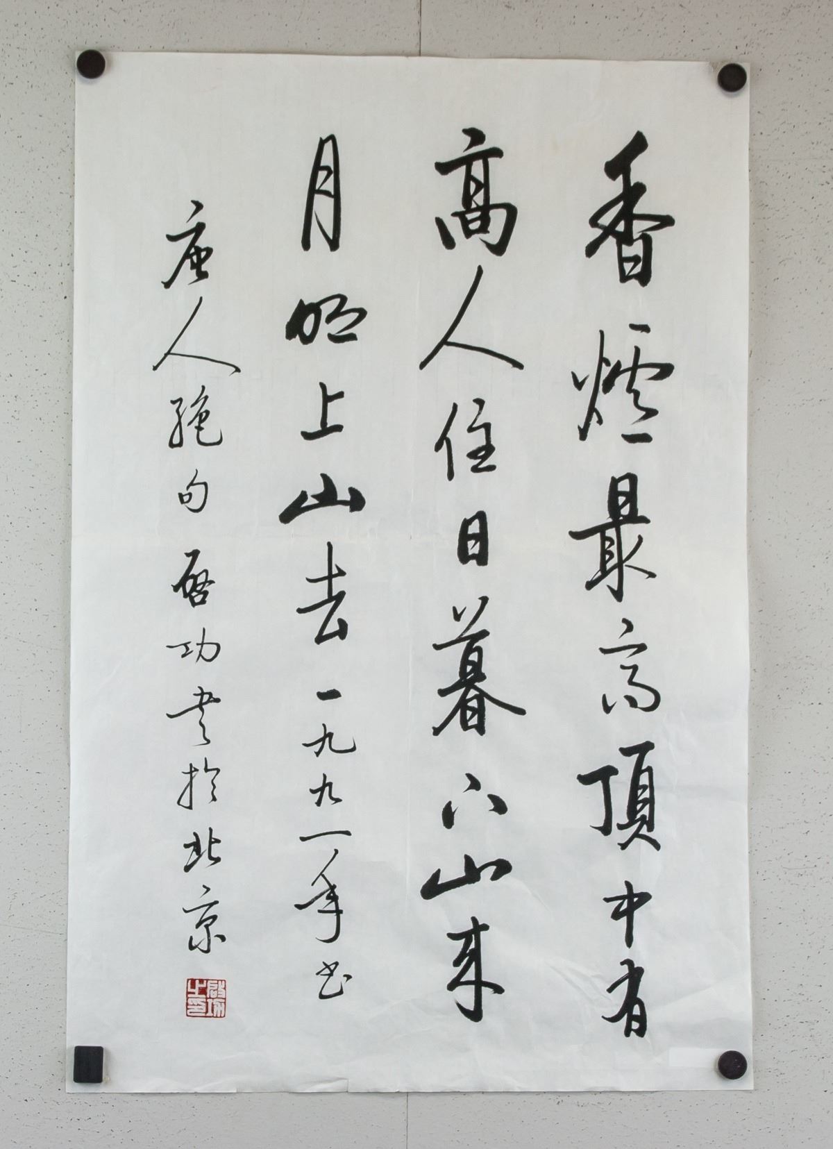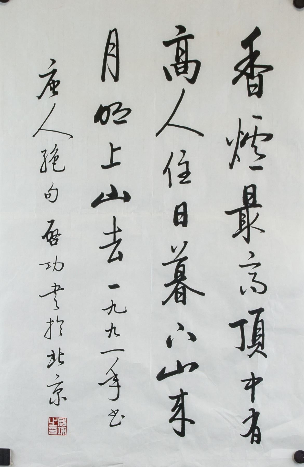Ink on paper, featuring Chinese calligraphy in semi-cursive script, signed and attr. Qi Gong (Chinese, 1912-2005), inscribed with 1 artist seal, dated 1991, 73 x 36 cm, Qi Gong was a Chinese calligrapher and painter known for his traditional landscapes and depictions of flowers and bamboo. Today, his work is included in the collection of the Metropolitan Museum of Art in New York.