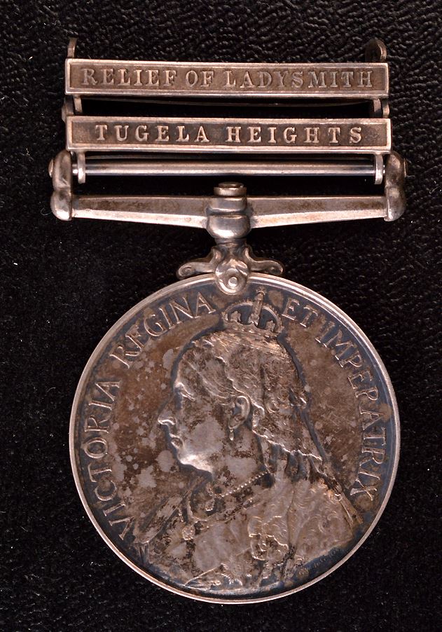 Queen's South Africa Medal, Two Bars, Tugela Heights, Defense of Ladysmith, engraved to "3081 PTE. T. BENNETT, RL.WT. SURREY REG'T", Good VF. Ribbon missing.