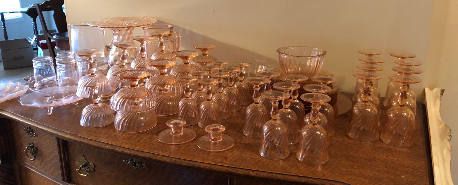 QTY OF PINK DEPRESSION GLASS INCLUDING GOBLETS, PLATES, BOWLS, CANDLE STICKS, PITCHERS.