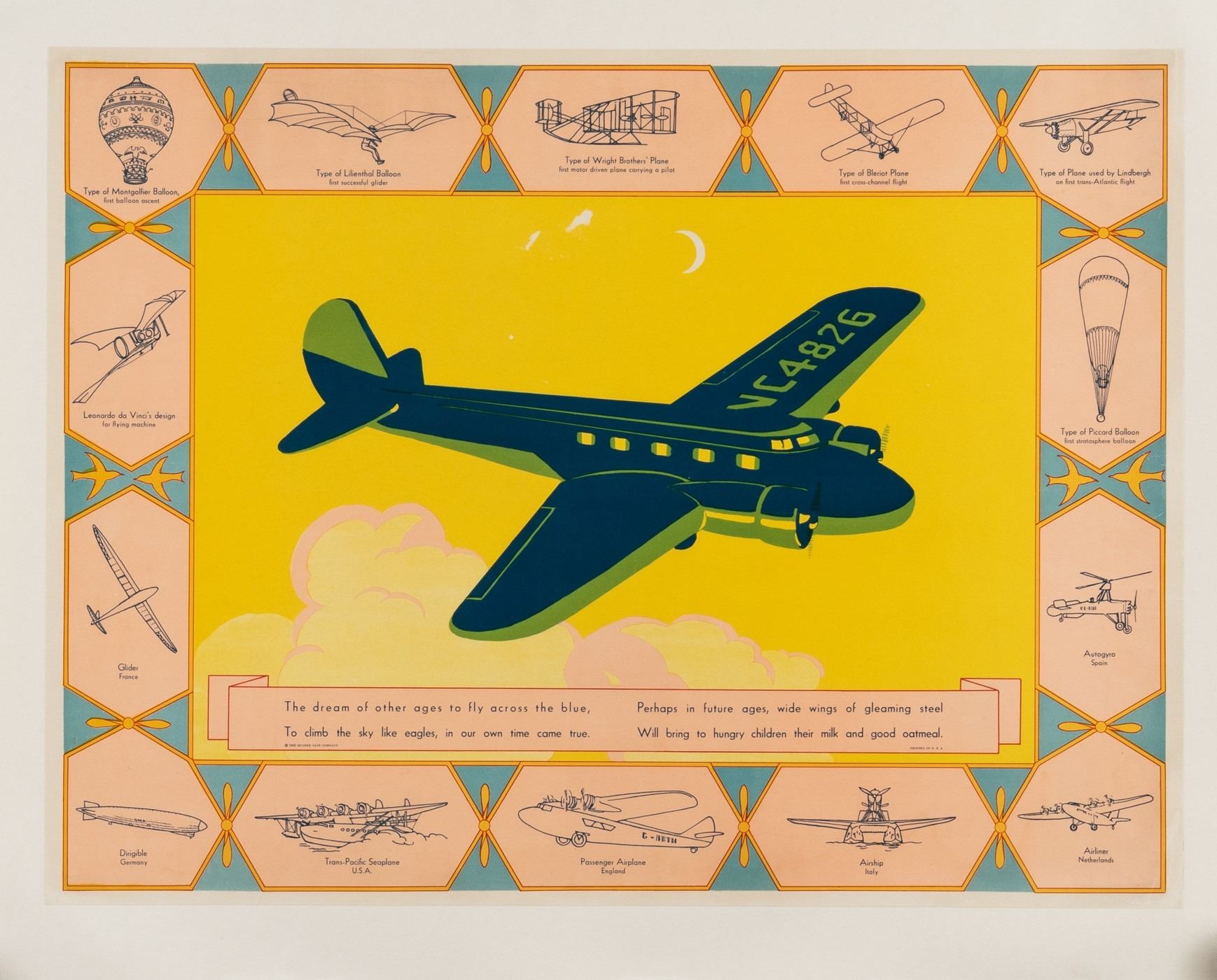 Promotional poster made by the Quaker Oats Company featuring a plane with illustrations of other methods of air transportation from history, linen-backed, 26 x 20 inches.
