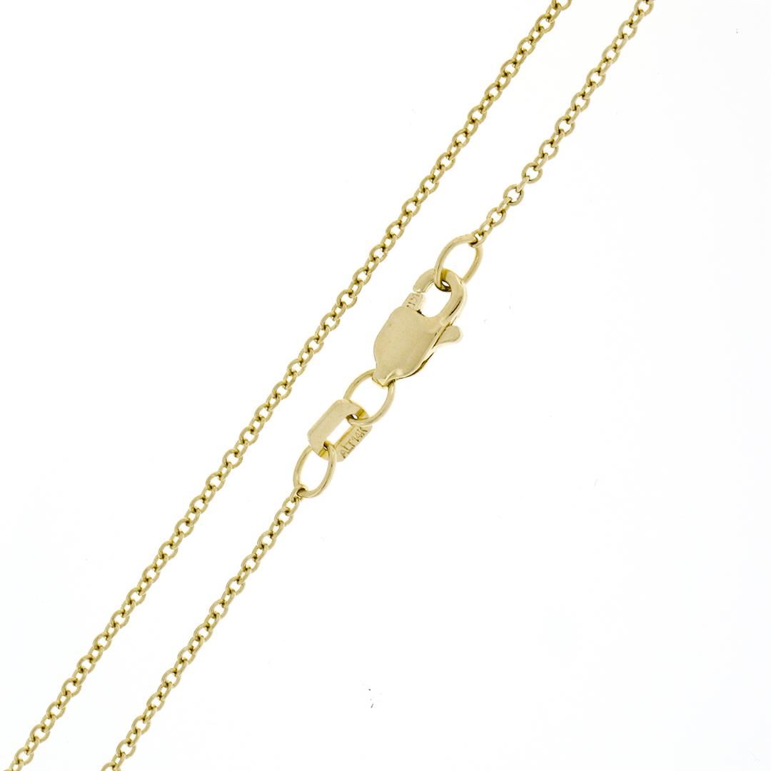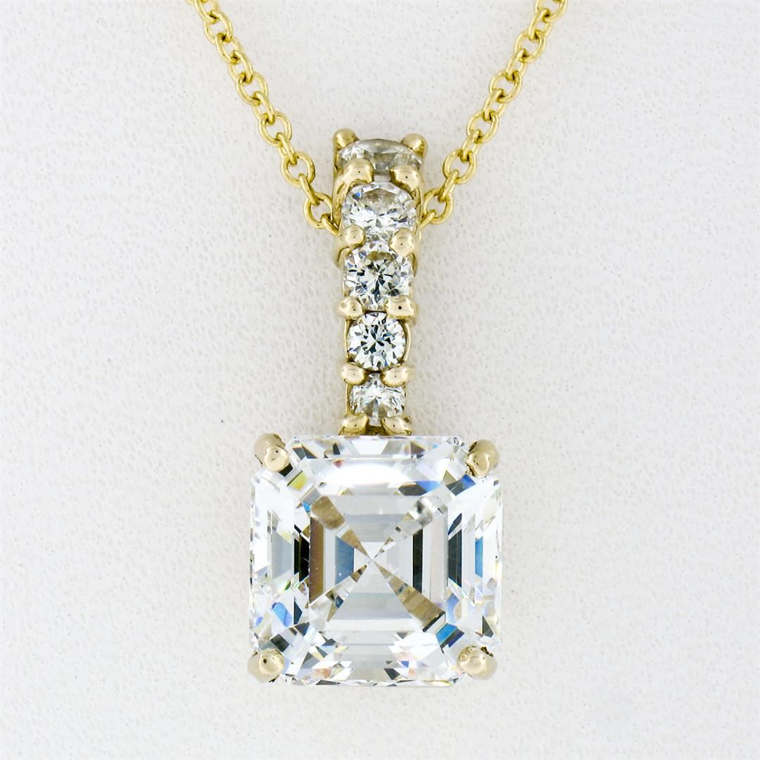 An estate solid 14k yellow gold solitaire pendant necklace, with 1 asscher cut cucic zircon (9.10x9.05mm), and 5 round brilliant cut cubic zircon ( 2.35mm to 3.0mm). The pendant weighs a total of 4.74 grams, measures 20.45x9.10mm including the bail, 18 inch cable link chain.