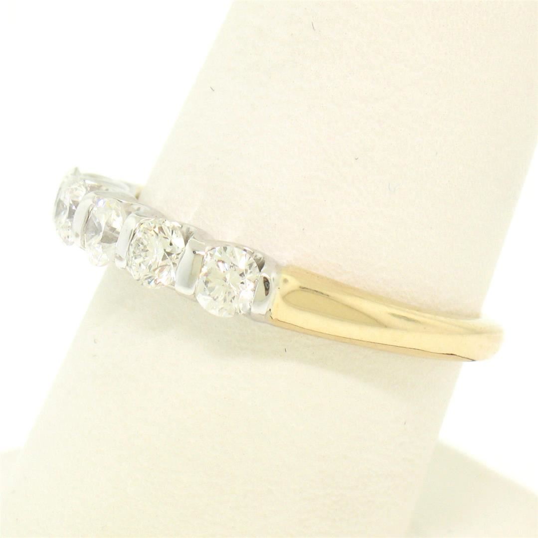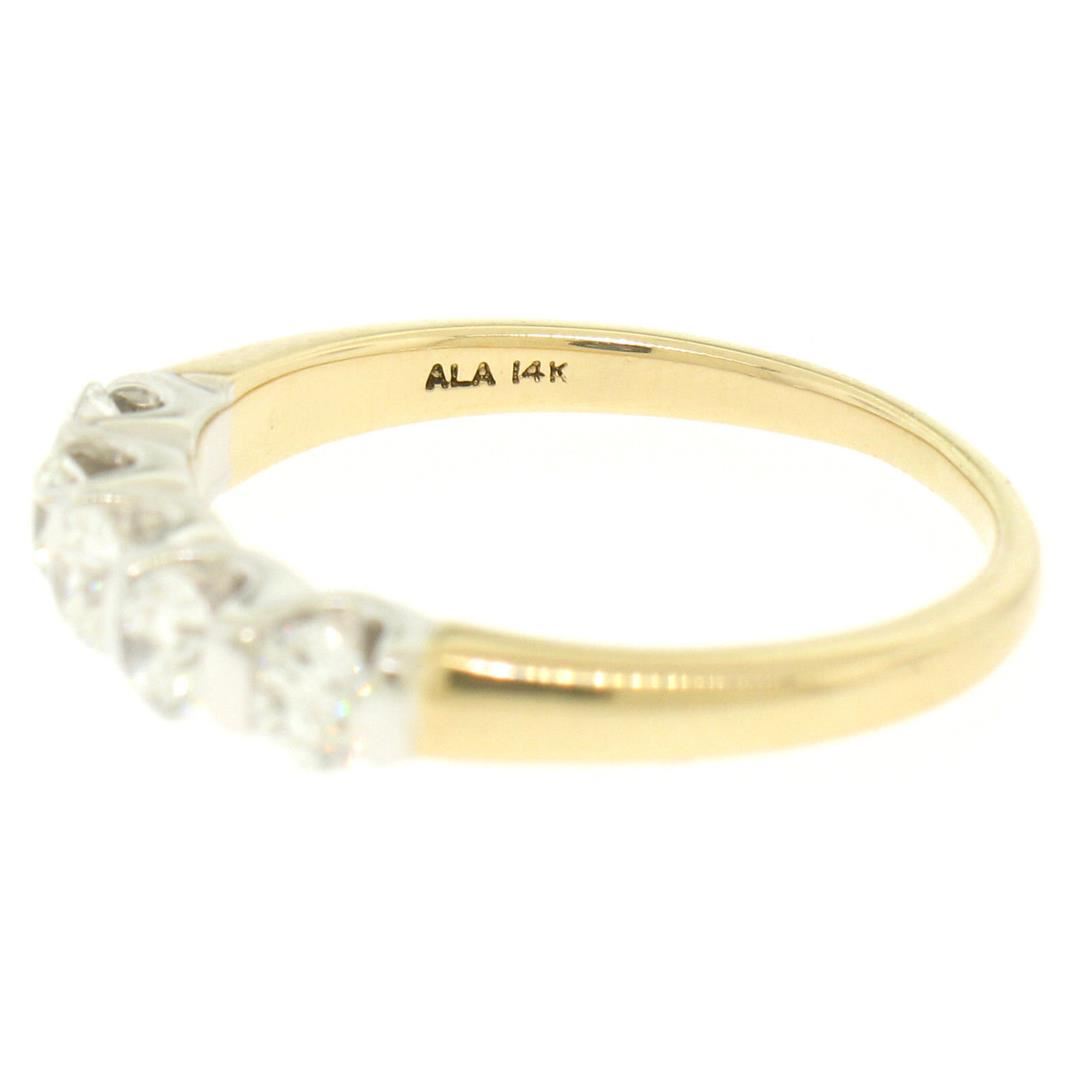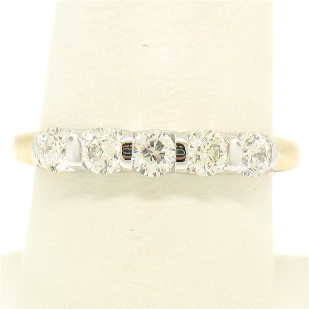 An estate solid 14k yellow and white gold band ring, with 5 round brilliant cut natural diamonds (F/G - VS1/VS2 ; 1.00ctw). The ring is size 8.75, weighs a total of 3.8 grams, and measures 3.54mm wide.