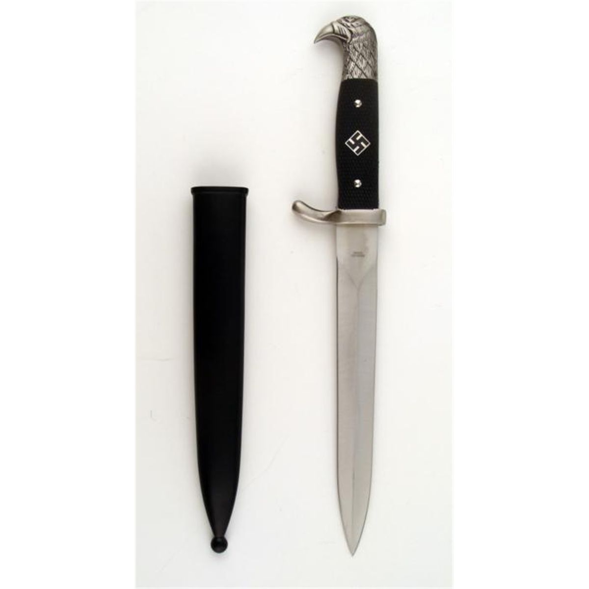 QUALITY EAGLE HEAD NAZI BAYONET W/SWASTIKA-WELL MADE FANTASY PIECE * BEAUTIFUL 9" FLAWLESS STAINLESS BLADE-MARKED STAINLESS-CHINA-NICELY DETAILED EAGLE HEAD POMMEL-DOUBLE RIVETED BLACK CHECKERED GRIP WITH INSET SWASTIKA-HEAVY BLACK METAL SCABBARD-MINT *