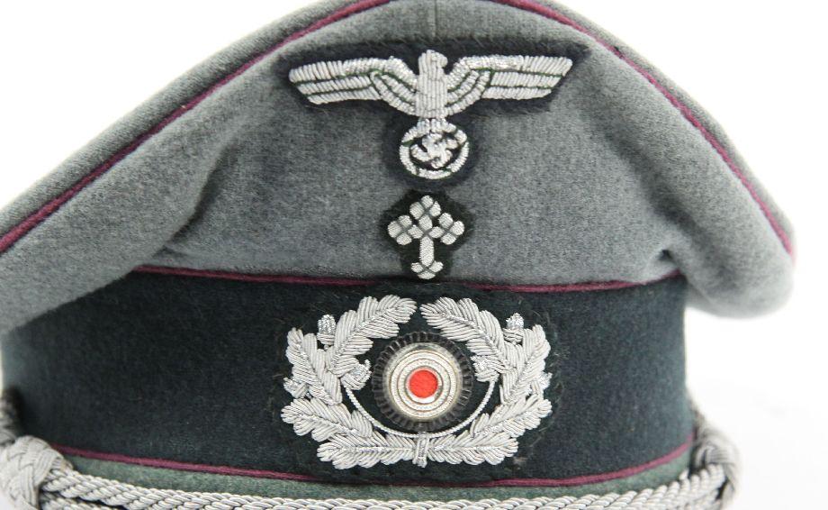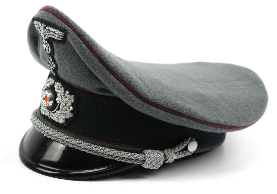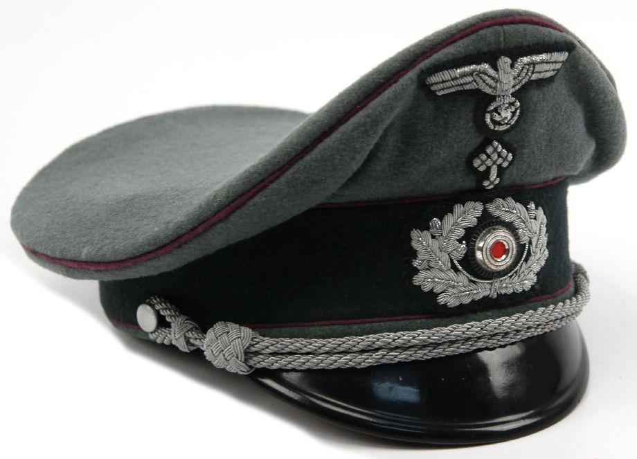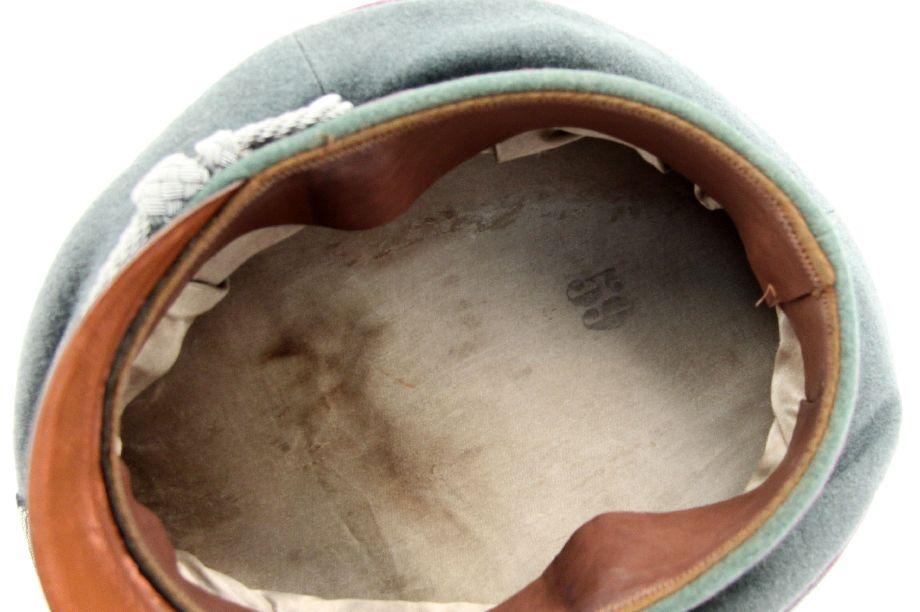 Reproduction WWII German visor cap. Very good condition, with minor mothing. Marked 59 on inside.