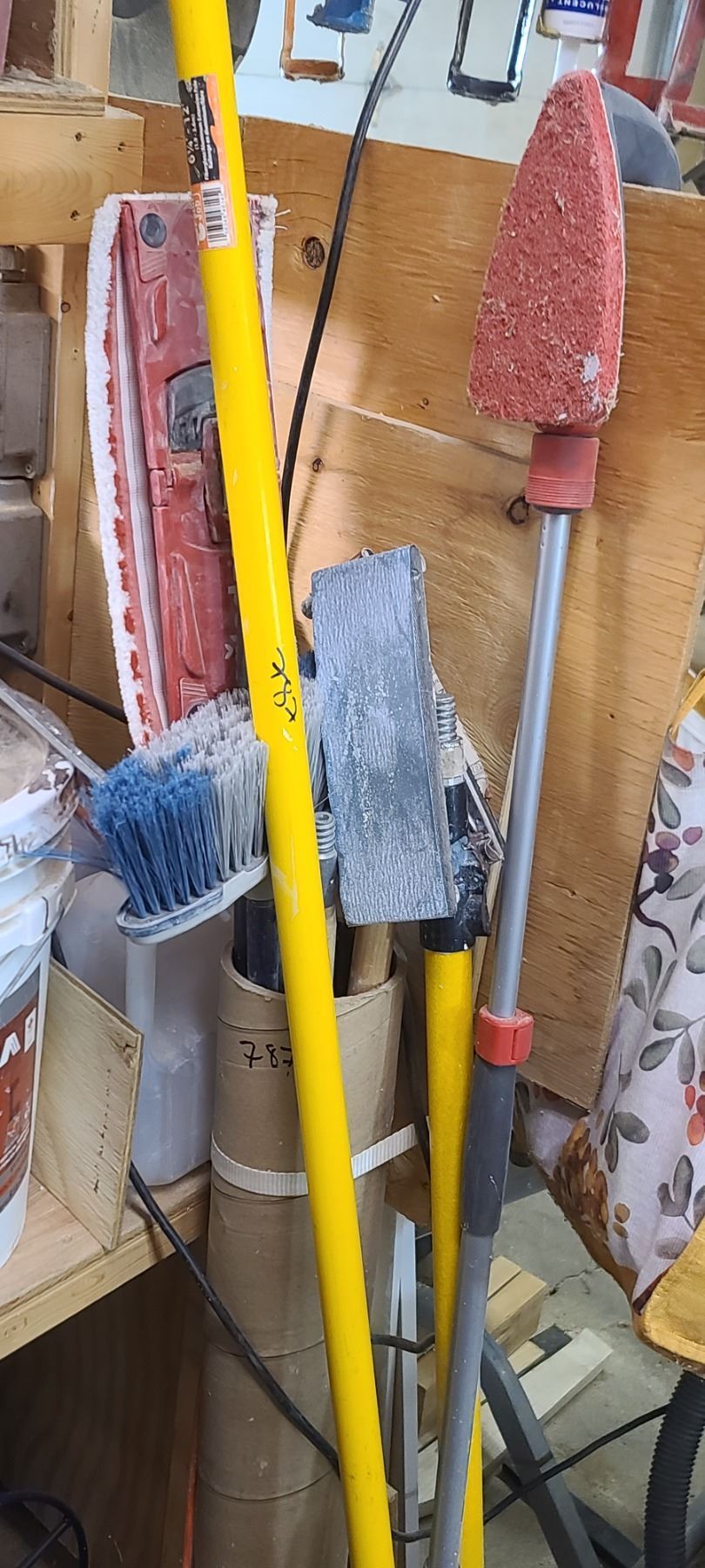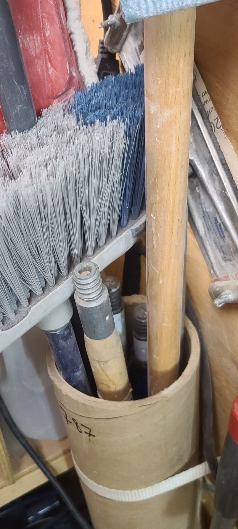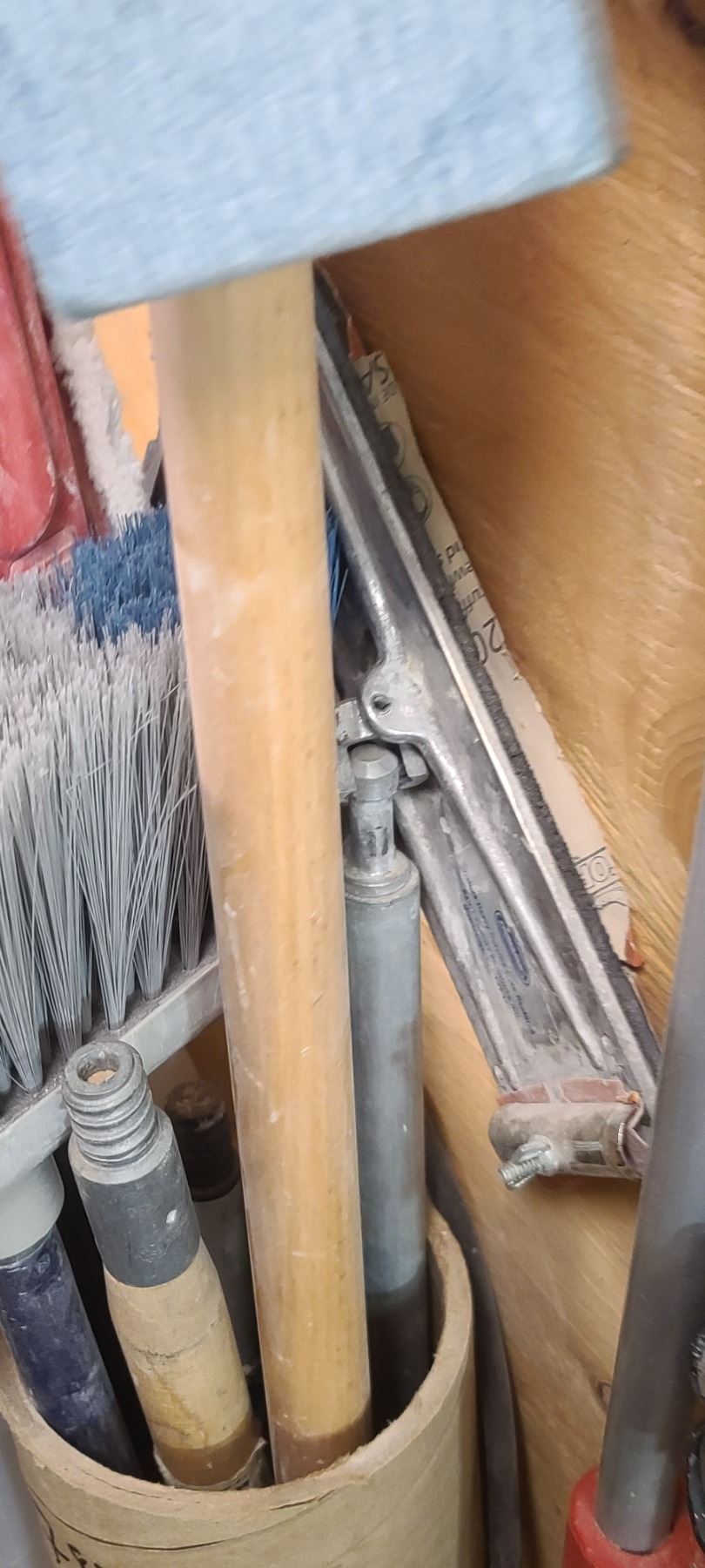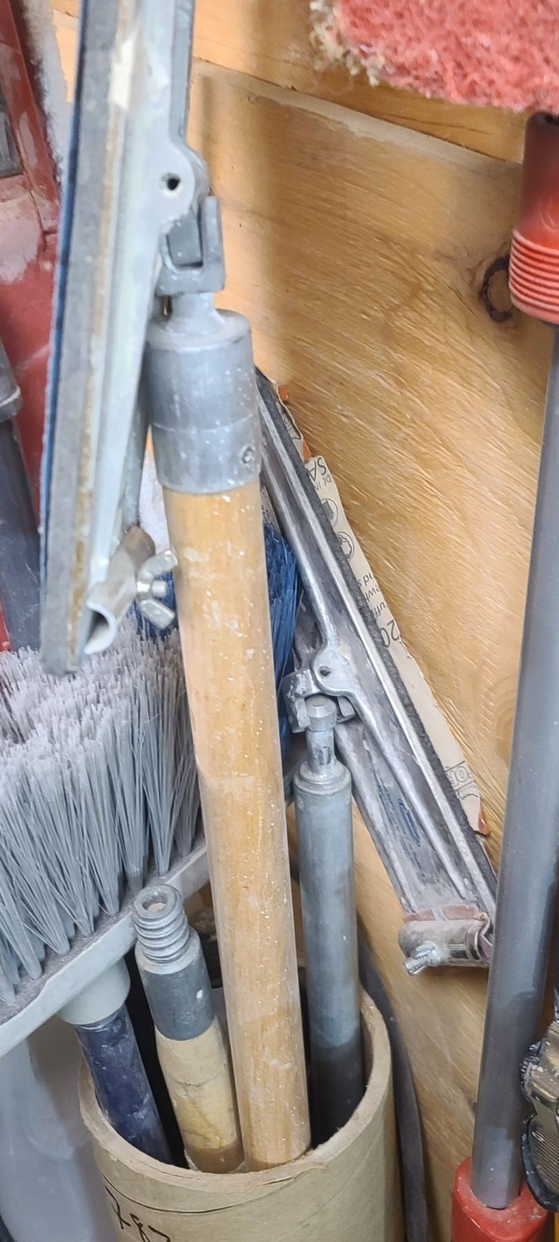 QUANTITY OF EMPTY PAIL EXTENSION HANDLES, BROOMS
