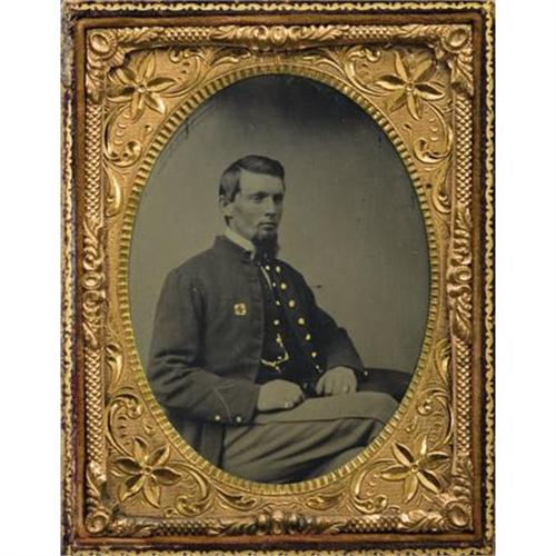 <B>QUARTER PLATE TINTYPE SEATED UNION PRIVATE WITH FIFTH CORPS BADGE ON CHEST CA 1860S.</B></I> This 3.25” x 4.25” image is of an unidentified union private corpsman belonging to the Fifth Corps. He is wearing a union jacket that has a gilded watch chain, buttons and Fifth Corps badge. He is seated in a photo studio looking very proud. This great image is cased in a half (no lid) period leather case, with oval gilded frame. <BR><BR><B>Condition:</B></I> Very fine, great contrast, couple of scratches under oval frame.<BR><BR><b>Shipping:</b> Miscellaneous Collectibles, Smal (<a target="_blank" href="http://www.heritageauctions.com/common/shipping.php">view shipping information</a>)