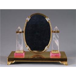 Lot 161 QUARTZ, DIAMOND AND VERMEIL MIRROR Fantastic oval mirror has gold vermeil frame which is encrusted with two bands of pavee diamonds at each corner. Mirror is suspended between two clear quartz columns which rest on rose quartz pedestals. All of this on a vermeil foot. Hallmarked on back “925” and “Moba”. SIZE: 10-1/4” w x 4-1/4” deep x 8-1/2” t. CONDITION: Very good to excellent. 5-71037