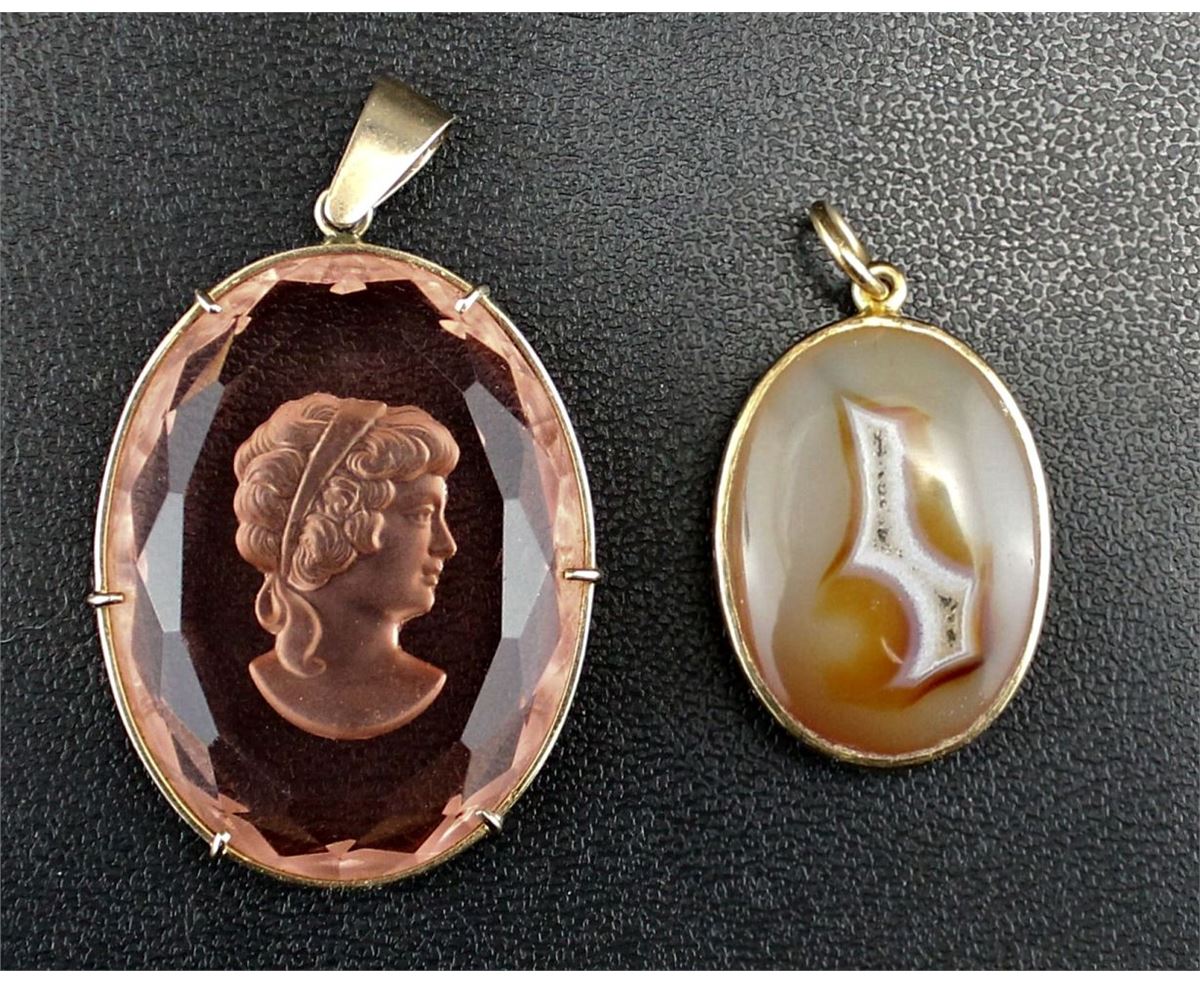 of a fair maiden set in a 14K frame,. together with a Chinese oval cabochon agate pendant in an 18K yellow gold setting. Quartzite, 1.5 x 1.25 inches Agate, 1.8 x .75 inches
