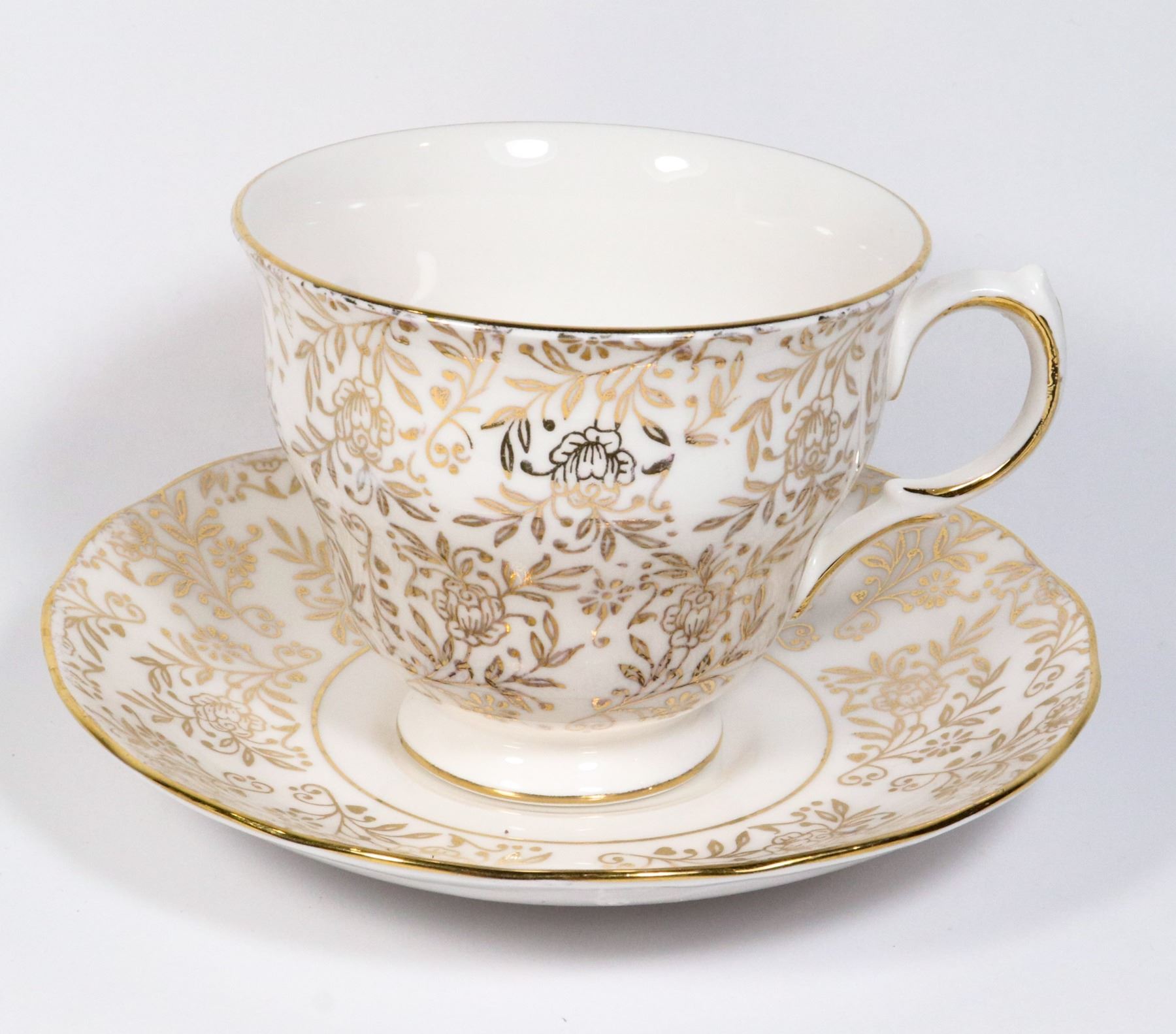 QUEEN AND GOLD TONE FLOWER PATTERN TEACUP & SAUCER