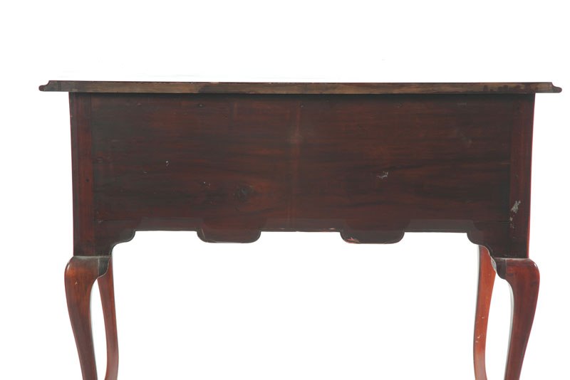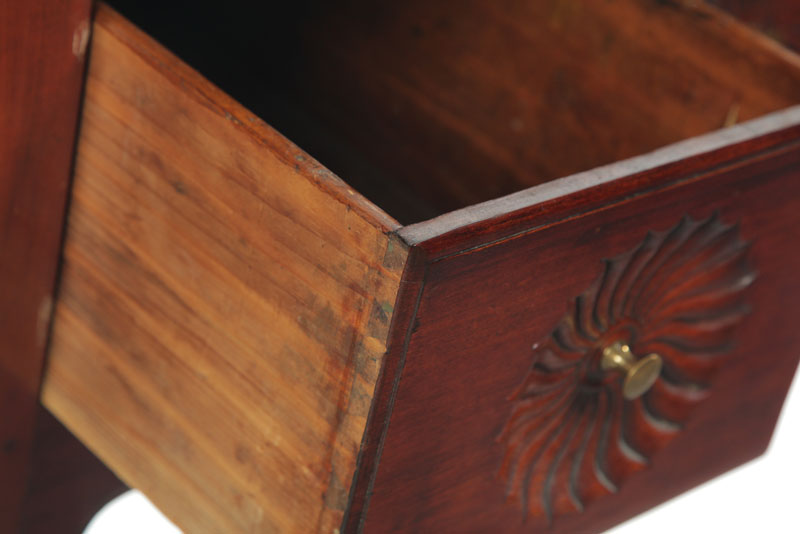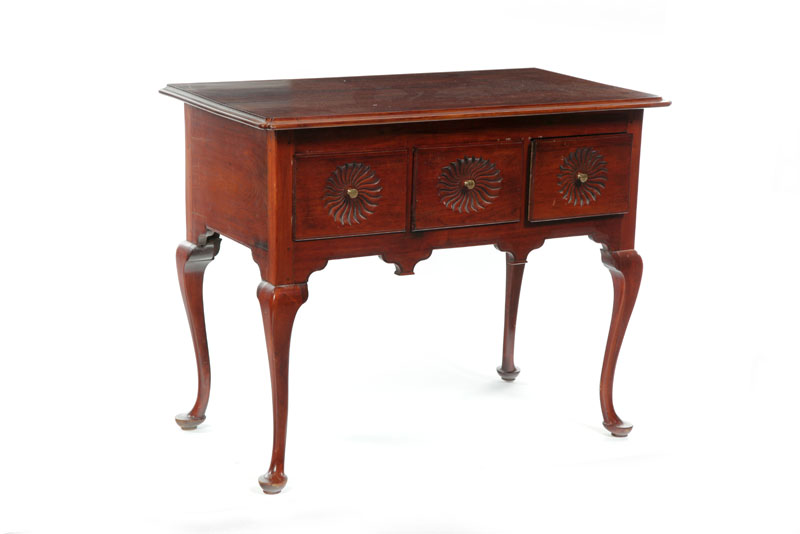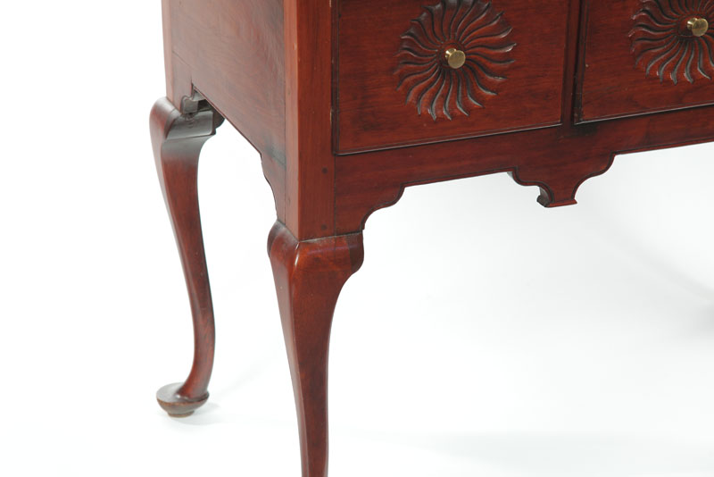 American,18th century, cherry. Made from teh base of a high chest of drawers, with cabriole legs with pad feet, case with apron drops, and three dovetailed drawers with carved sunbursts. Imperfections. 30 3/4"h. 38 3/4"w. 21 1/4"d.