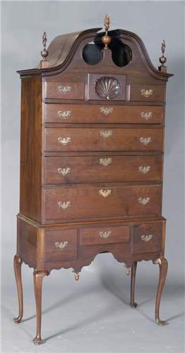 QUEEN ANNE MAHOGANY HIGHBOY with clamshell carved drawer, and later added bonnet top, 18th century
