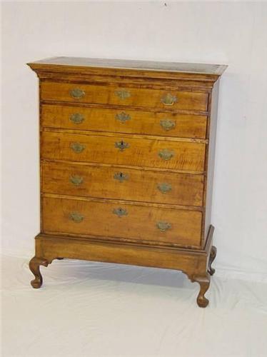 QUEEN ANNE MAPLE GRADUATED 5 DRAWER CHEST (SOME TIGER MAPLE) RAISED ON A BENCH MADE QUEEN ANNE STYLE FRAME W/ CABRIOLE LEGS - WEAR & IMPERFECTIONS;