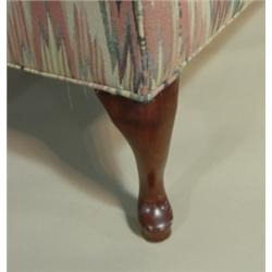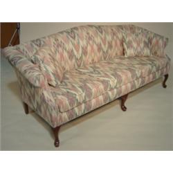 QUEEN ANNE STYLE CAMEL BACK SOFA with two pillows. Pad feet. 32.5" H to top of back, 73" W, 18" H to top of seat.