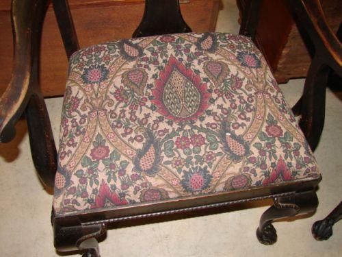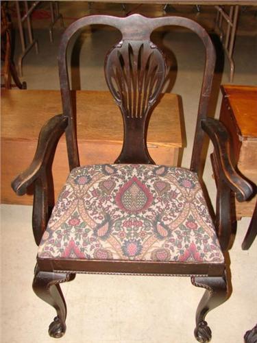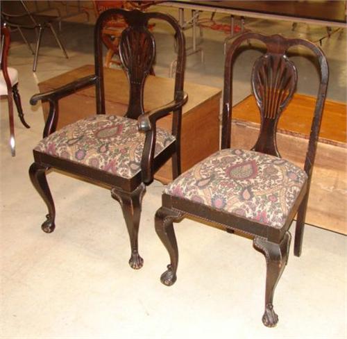 PAIR OF QUEEN ANNE STYLE CHAIRS. Consists of one side chair & one arm chair. Upholstered seats. Cabriole legs. Side chair shows repair at back crest. 40” H to top of back, 26.5” W (armchair), 19” W (side chair).